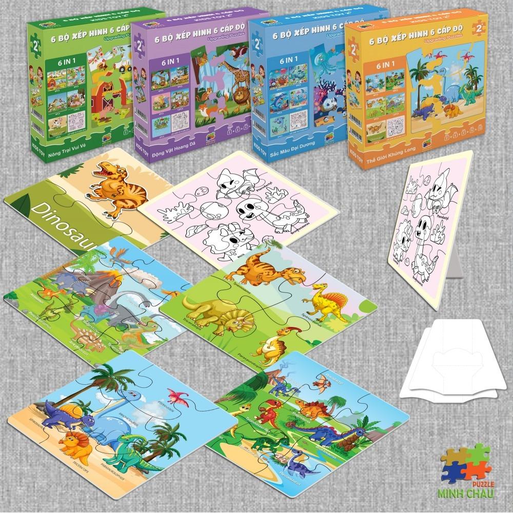 ✨Bộ 6 Tranh Xếp Hình 6 Cấp Độ 17 x 17 cm - Thế Giới Khủng Long - Minh Châu C6-001