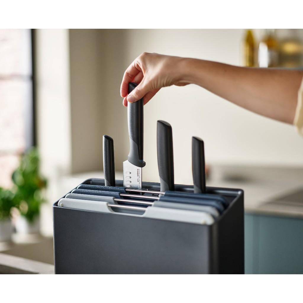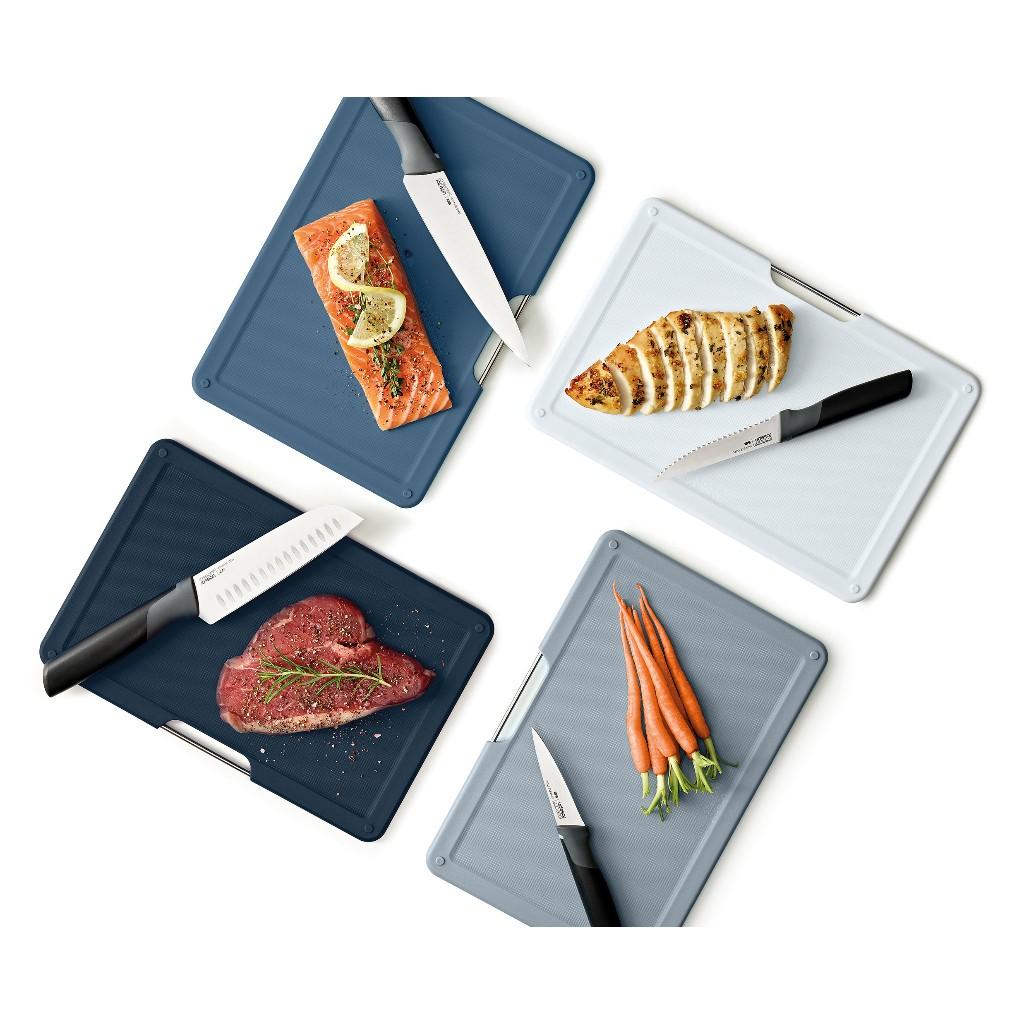 Folio Plus kết hợp bốn thớt được mã hóa màu với bốn loại dao tương ứng. Mỗi thớt đều có bề mặt cắt thân thiện với dao, thanh chọn bằng thép không gỉ và chân chống trượt. Bốn loại dao bằng thép không gỉ của Nhật Bản có giá đỡ dụng cụ tích hợp giúp cải thiện vệ sinh và giảm thiểu sự bừa bộn khi đặt dao xuống. Cả thớt và dao đều được cất trong hộp góc cạnh, giúp mặt bàn bếp gọn gàng và ngăn nắp, đảm bảo các vật dụng cần thiết để cắt của bạn luôn trong tầm với.