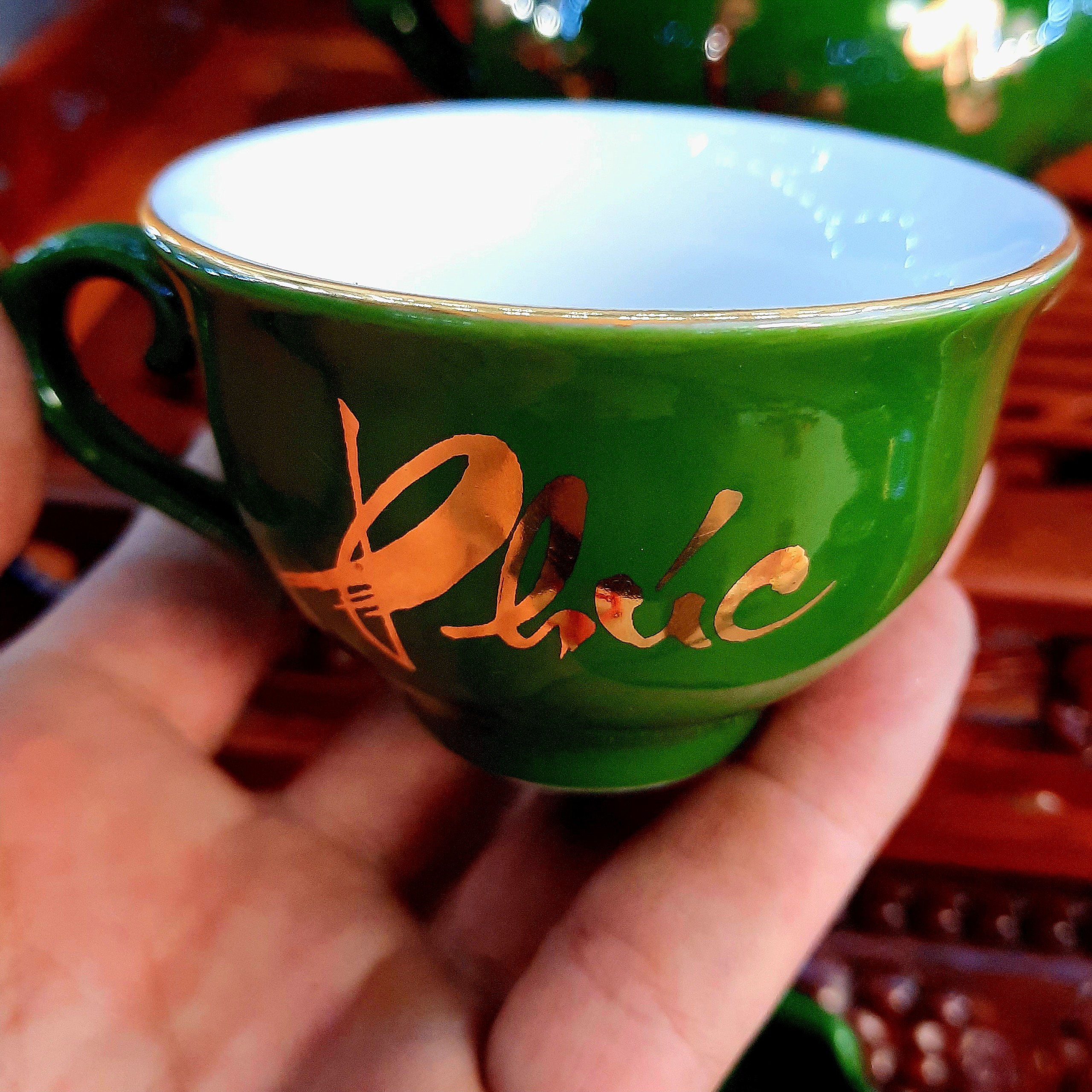 Bộ ấm chén Phúc Lộc Thọ dáng chóp men lục bảo vẽ vàng Gốm sứ Bát Tràng cao cấp Dung tích 430ml 1 ấm 6 chén 7 đĩa kê giá 650k