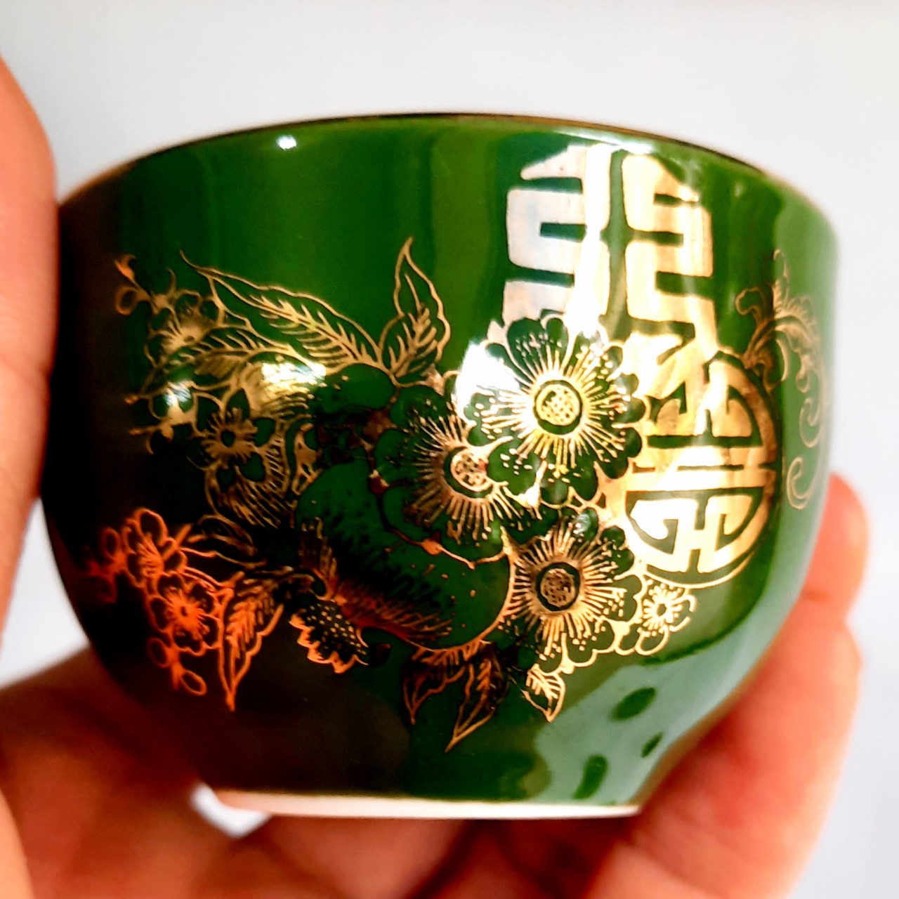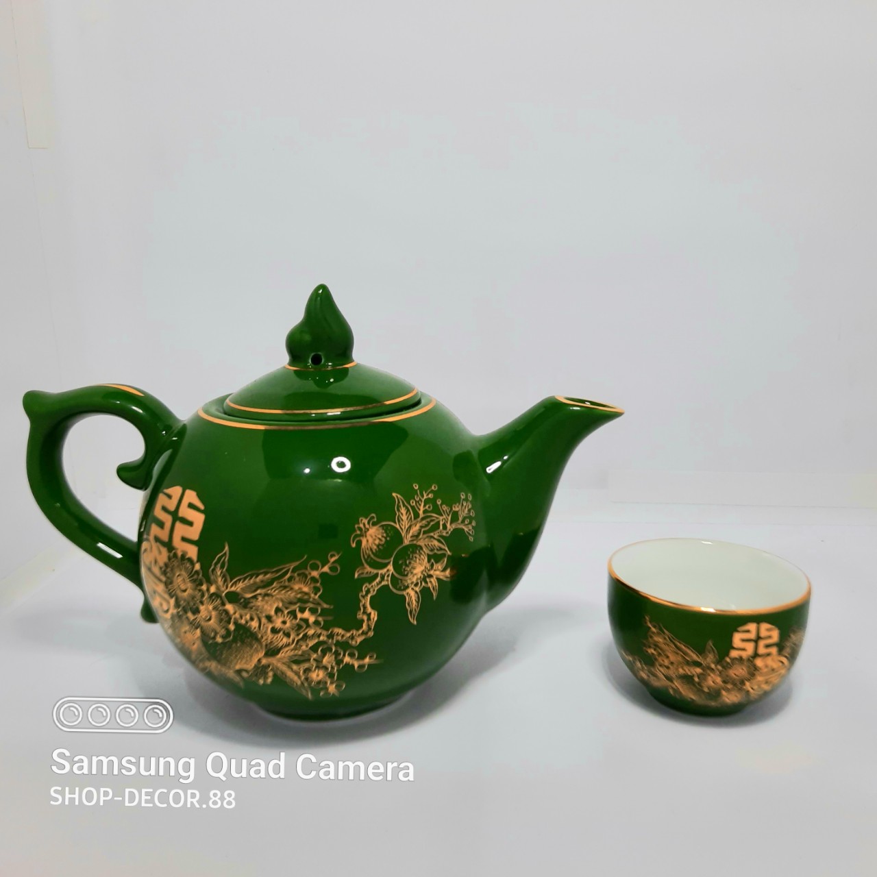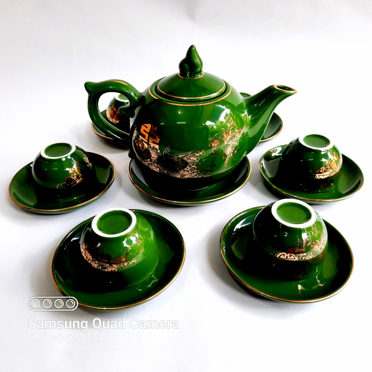 Bộ bình trà ấm chén men xanh ngọc lục bảo vẽ vàng 24k, gốm sứ bát tràng tinh vân, 0986469896,tea pot