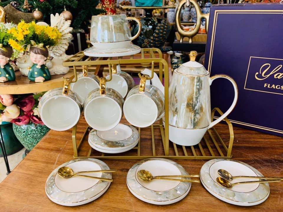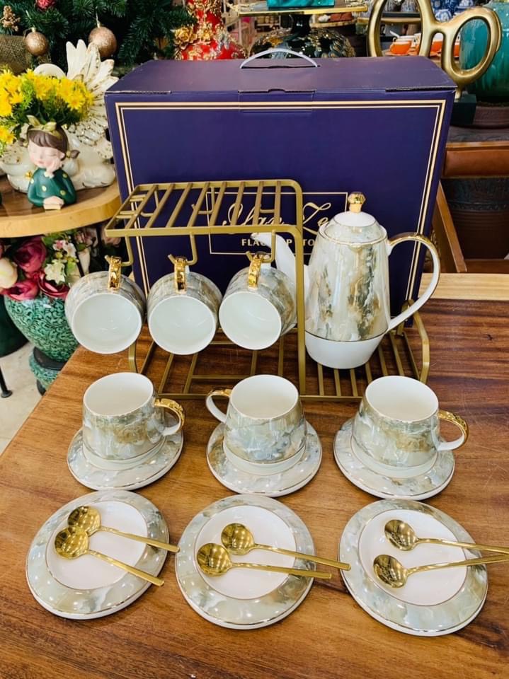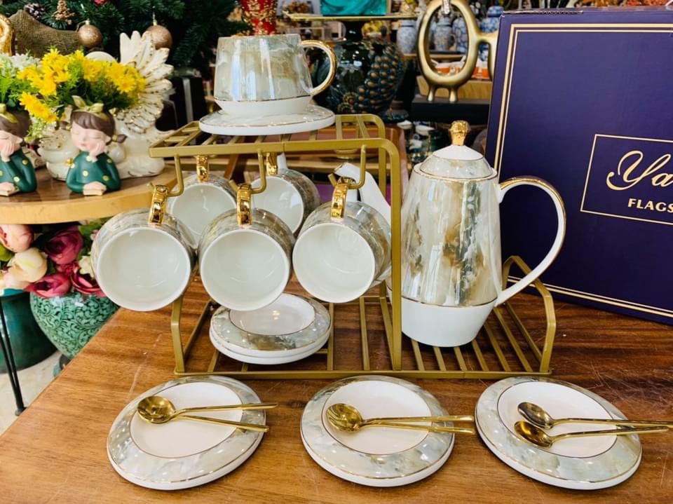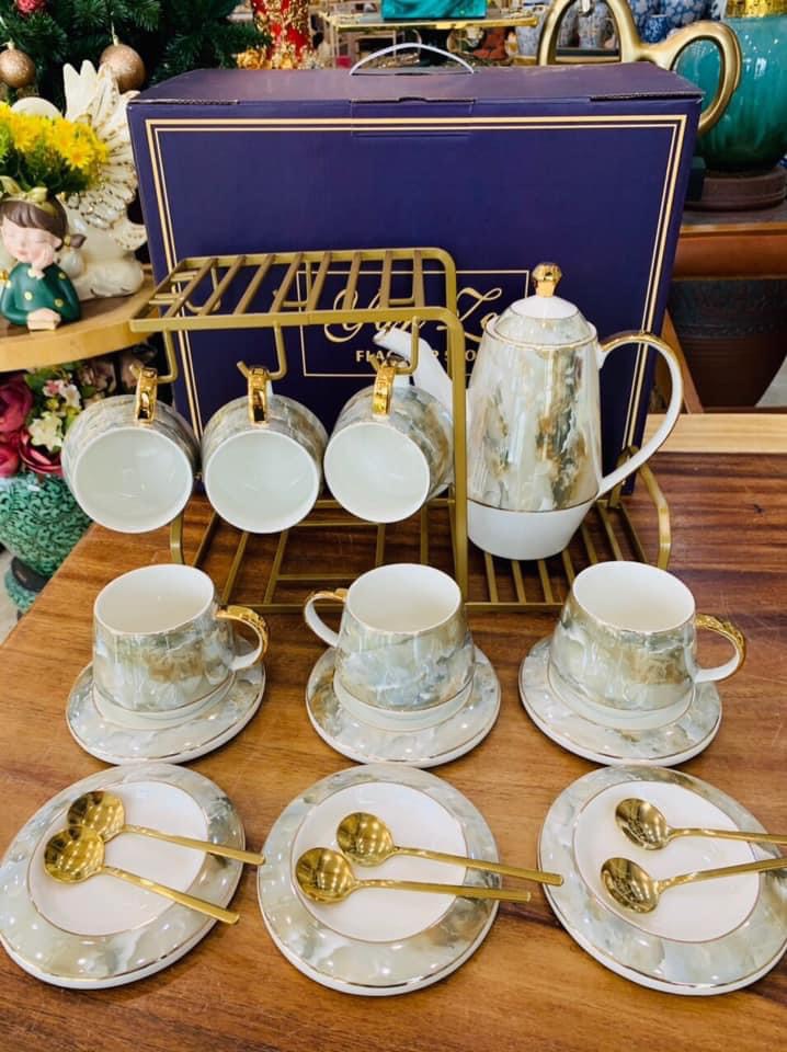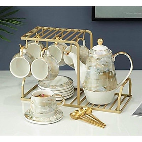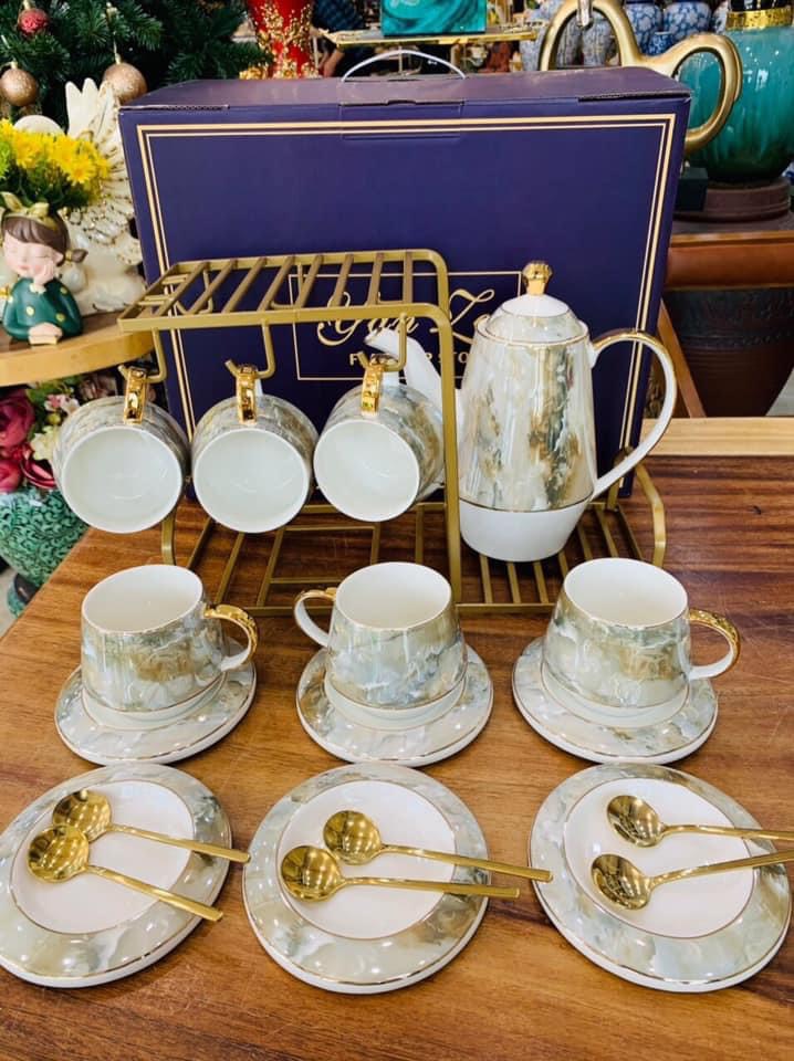 ✨BỘ ẤM CHÉN PHA TRÀ TRẮNG VÂN ĐÁ CẨM THẠCH CÓ ĐĨA TÁCH KÈM GIÁ TREO CỐC