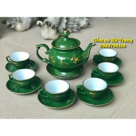 Bộ ấm chén Phúc Lộc Thọ dáng chóp men lục bảo vẽ vàng Gốm sứ Bát Tràng cao cấp Dung tích 430ml 1 ấm 6 chén 7 đĩa kê giá 650k