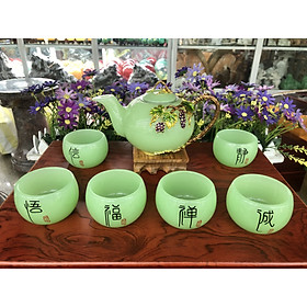 ✨Bộ ấm trà chạm cây nho tím với ly chạm chữ đá ngọc cẩm thạch xanh