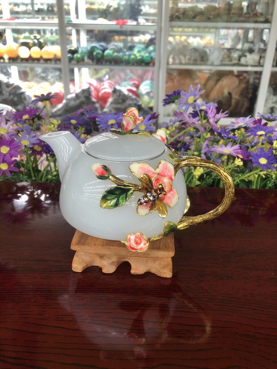 ✨Bộ ấm trà chạm hoa hồng với ly chạm chữ đá bạch ngọc