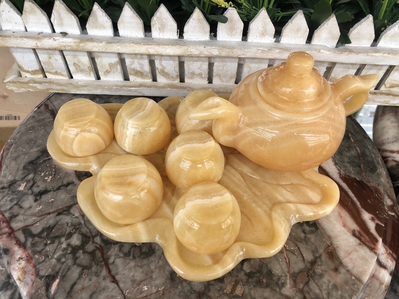 Chất liệu: Đá ngọc Onyx Bộ sản phẩm gồm: 7 dĩa, 6 ly và 1 ấm trà Khối lượng: 1,5 kg Sử dụng làm vật phẩm trang trí nhà cửa, quà biếu hoặc có thể