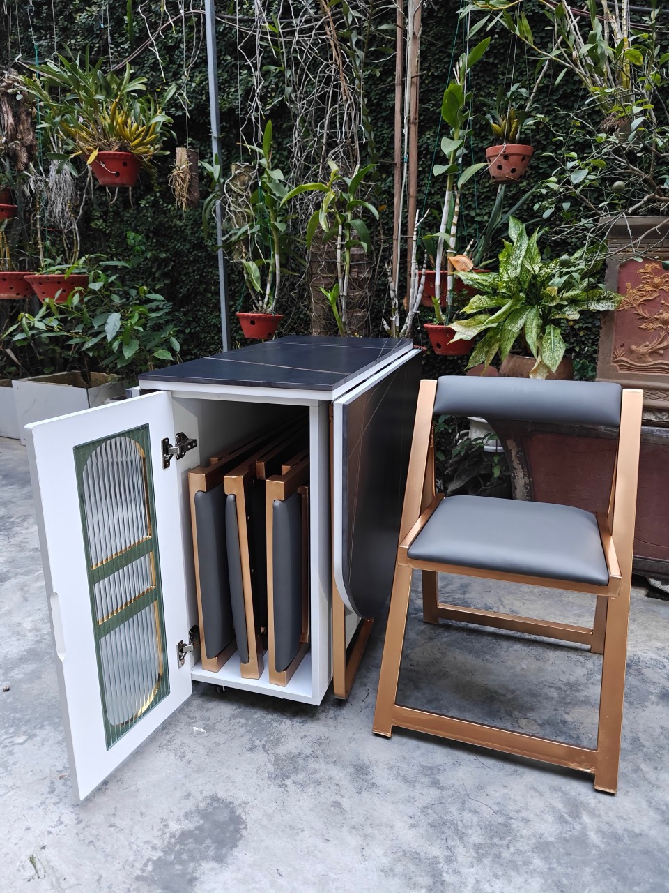 Cận cảnh bộ bàn ăn thông minh xếp gọn ghế vào khung bàn - Bàn Ăn Nhập Khẩu 077.596.1234