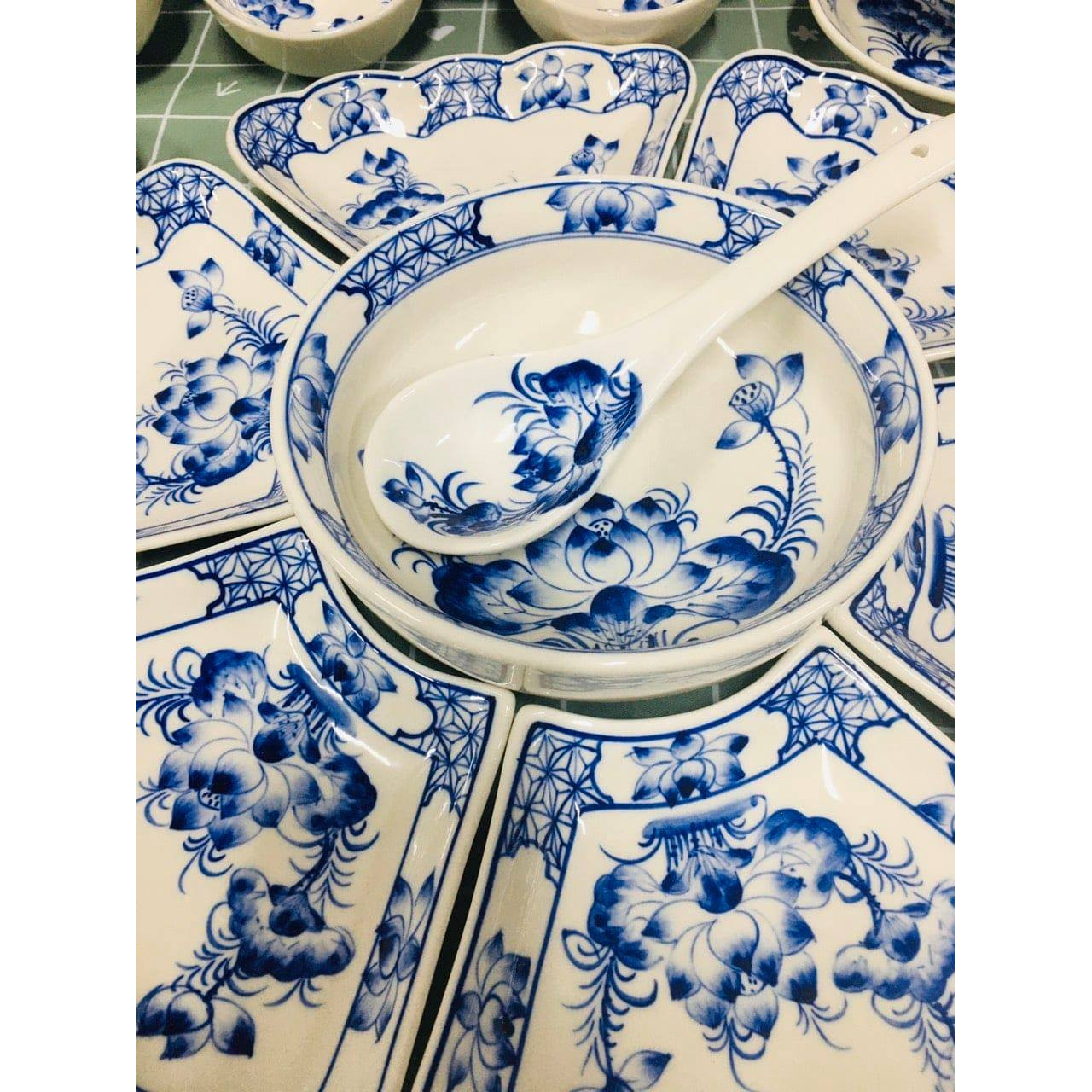 Bộ đồ ăn men lam vẽ hoa đào Gốm sứ Bát Tràng cao cấp không chì Bộ đồ ăn gồm 15 món như hình 6 bát cơm 1 bát mắm 1 đĩa muối 1 đĩa