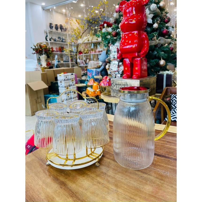 ✨Bộ bình đựng nước uống thủy tinh kèm 6 cốc sọc tăm và giá úp cốc