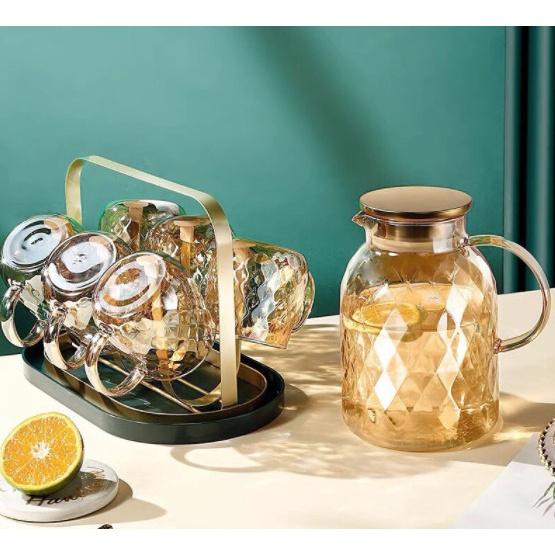 ✨Bộ bình đựng nước uống thủy tinh màu vàng golld sang trọng vân karo chéo ( không bao gồm khay và giáp úp)