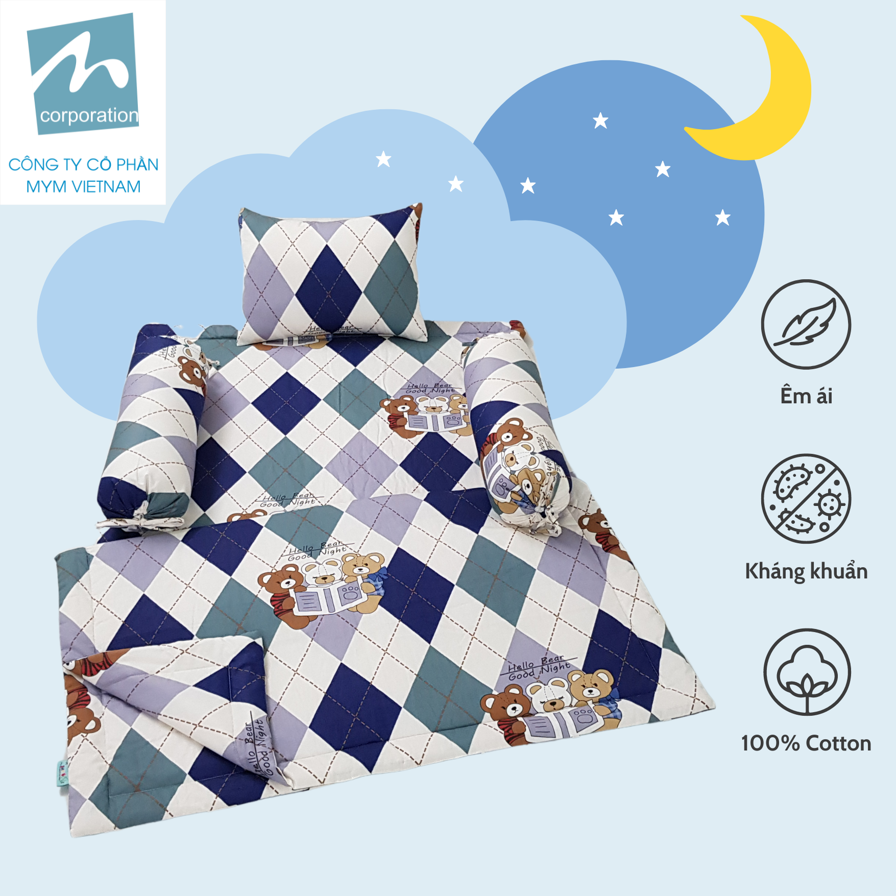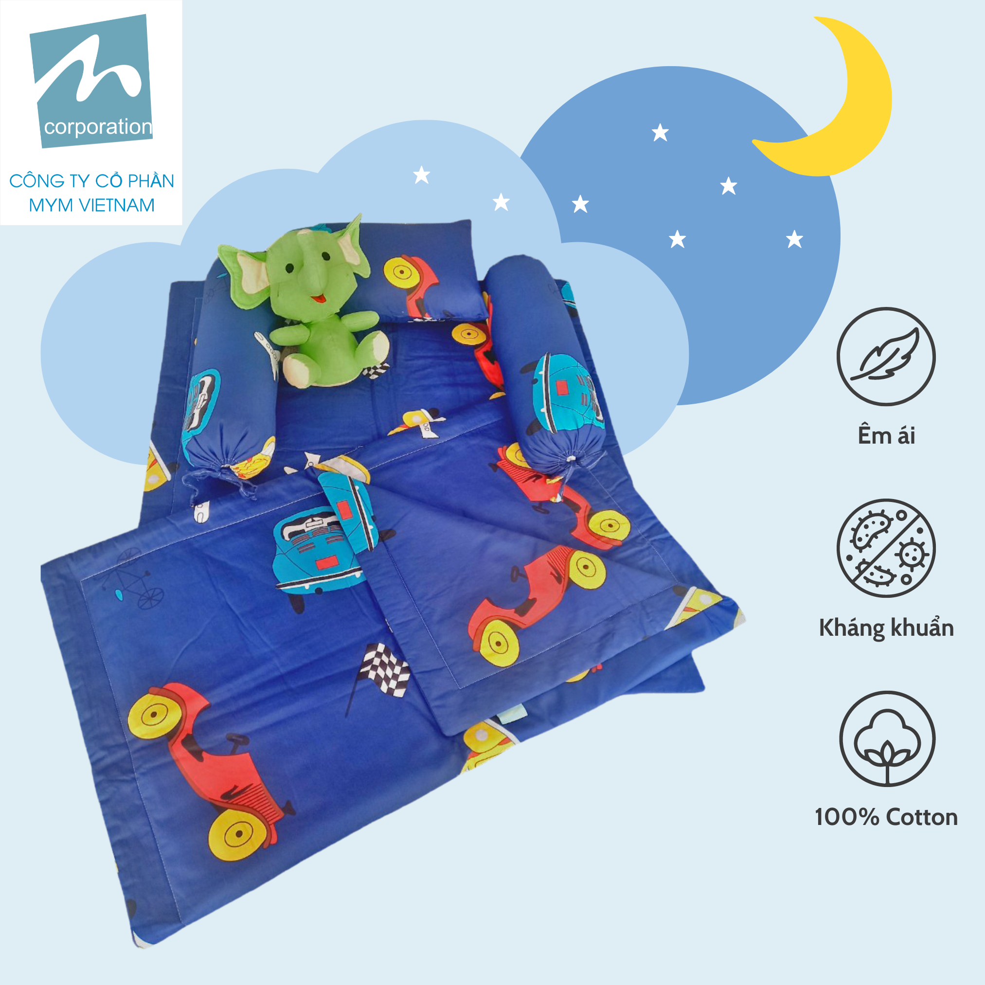 ✨Bộ chăn gối nệm cho bé MYM chất liệu vải Cotton mềm mại, thấm hút