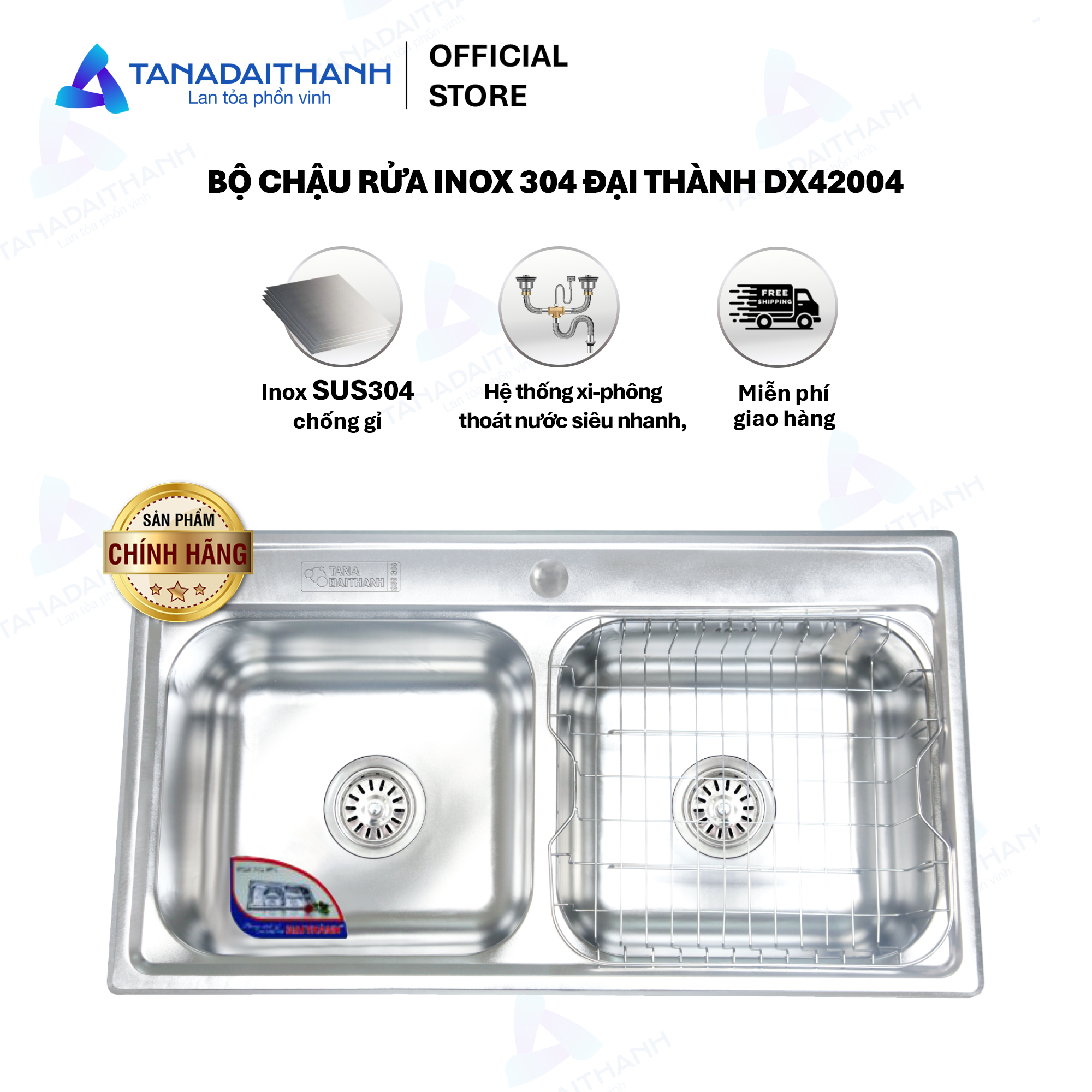 Bộ chậu rửa inox 304 Đại Thành DX42004 - Chỉ bán miền Nam và Tây Nguyên, Hàng chính hãng LƯU Ý: Khách hàng vui lòng chọn mua đúng nhãn (Tân Á/Đại Thành) theo tỉnh thành