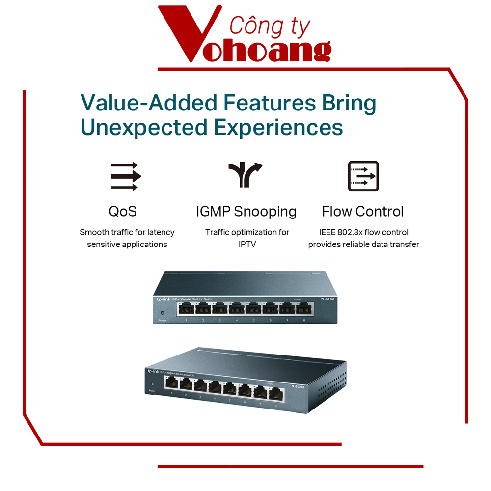 - 8 cổng Gigabit – Truyền dữ liệu tốc độ cao đến 1000Mbps - Chuẩn IEEE 802.3/3u/3ab – Tương thích rộng rãi với thiết bị mạng - Cắm vào là chạy – Không cần cấu