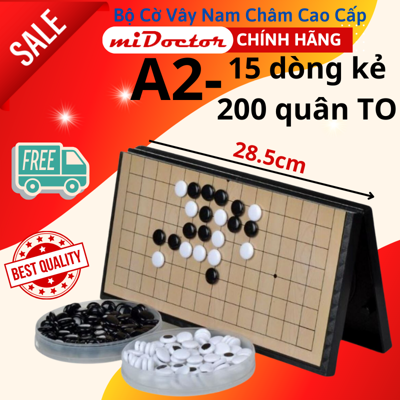 Phân loại: Cờ Vây A1 kích thước 28.5 x 28.5cm, ✓ Kích thước hộp Dài 29cm x Rộng 15cm x Dày 3cm, trọng lượng 0.65kg, ✓ Số dòng kẻ 19 dòng, ô vuông kích thước 1,2cm ✓ Số quân 150 đen + 151 trắng, quân cờ đường kính 1.2cm, cao 0.4cm (có gắn nam châm) Cờ Vây A2 kích thước 28.5 x 28.5cm ✓ Kích thước hộp Dài 29cm x Rộng 15cm x Dày 3cm, trọng lượng 0.63kg ✓ Số dòng kẻ 15 dòng, ô vuông kích thước 1,5cm ✓ Số quân 100 đen + 101 trắng, quân cờ đường kính 1.5cm, cao 0.5cm (có gắn nam châm) Cờ Vây B1 kích thước cỡ đại 37 x 37cm, ✓ Kích thước hộp Dài 37cm x Rộng 19cm x Dày 5cm, trọng lượng 1.4kg ✓ Số dòng kẻ 19 dòng, ô vuông kích thước 1.4cm ✓ Số quân 180 đen + 181 trắng, đường kính quân cờ 1.7cm. cao 0.5cm (có gắn nam châm)