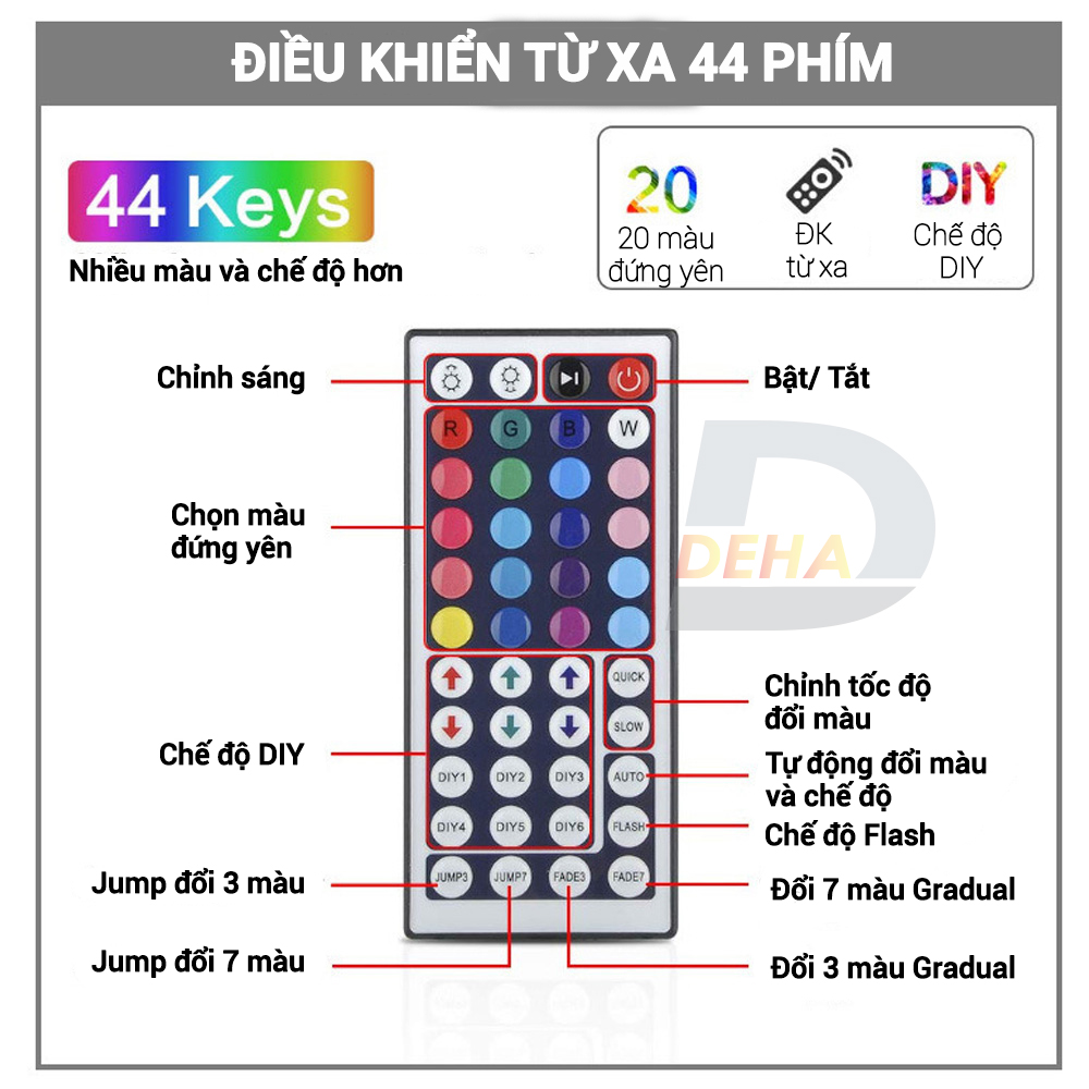 Điều khiển từ xa 44 phím chọn 20 màu đứng yên, các chế độ nháy, tự động chuyển màu mềm mại.