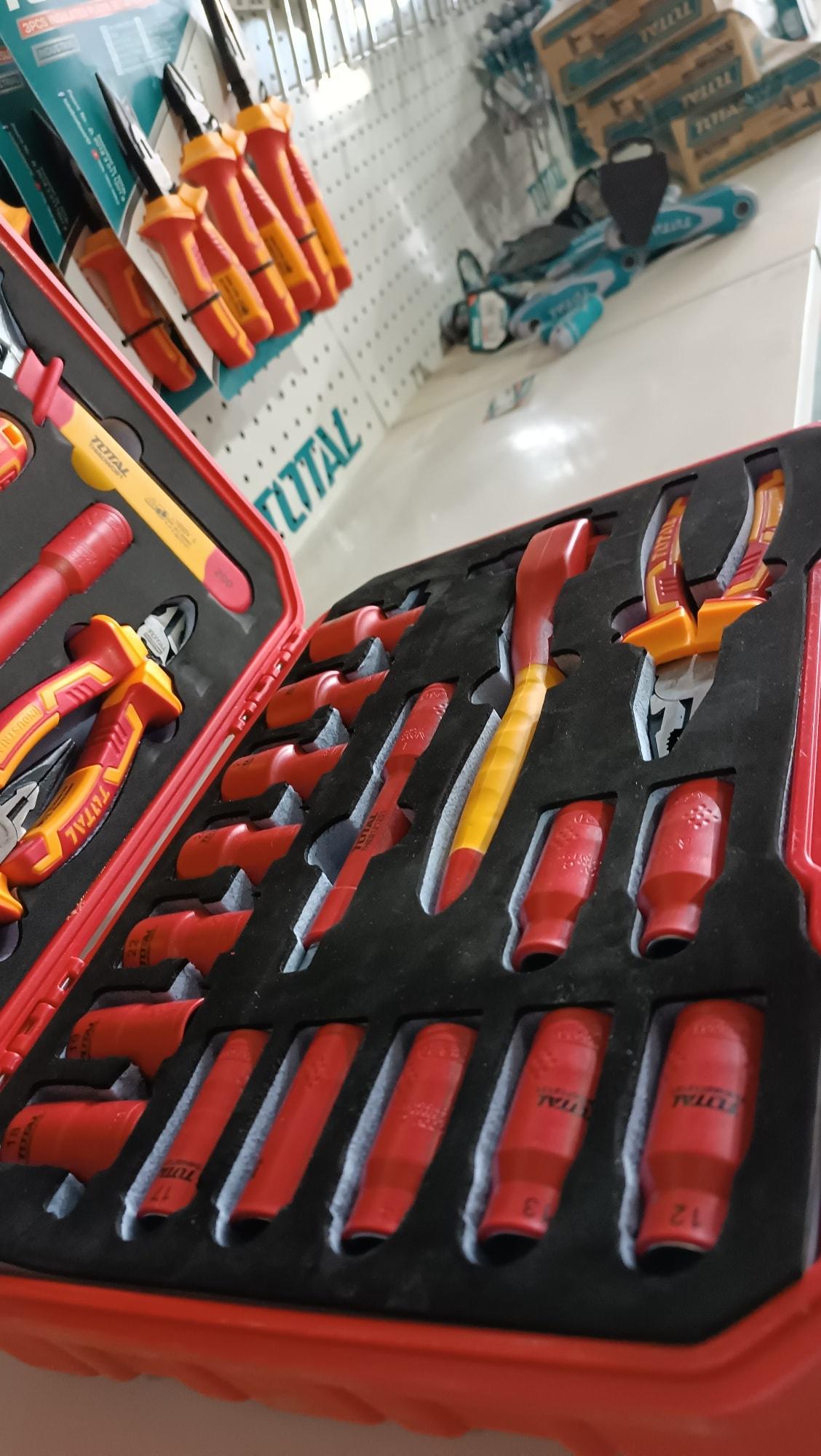 -1 kềm cắt chéo cách điện 160mm;. 3 kềmTua vít dẹp cách điện: SL3.0x75mm; SL4.0x100mm; SL5.5x125mm;. 2 tua vít phillips cách điện: PH1x80mm; PH2x100mm;. 14 ổ cắm hình lục giác cách điện 1/2 "(10mm, 11mm, 12mm, 13mm, 14mm, 16mm, 17mm, 18mm, 19mm, 22mm, 24mm, 27mm, 30mm, 32mm); 1 mỏ lêch cách điện 200mm;. 2 Thanh mở rộng cách điện: 1/2 "x125mm; 1/2" x250mm, 1 Cái cờ lê vặn cách điện 1/2 "; 1/T