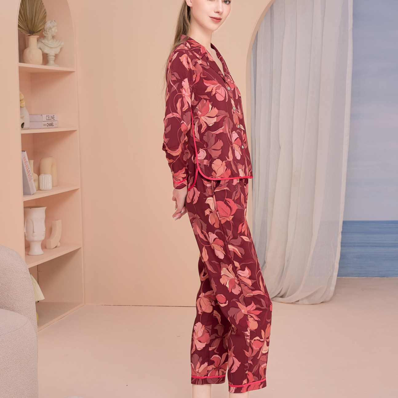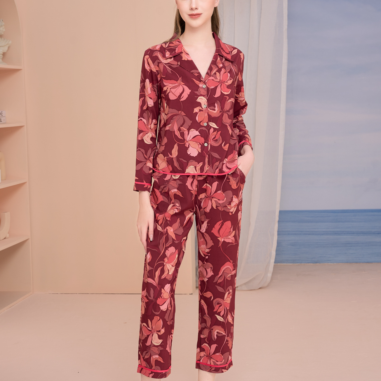 Bộ satin dài tay, viền nổi bật, cổ dan-ton nhọn