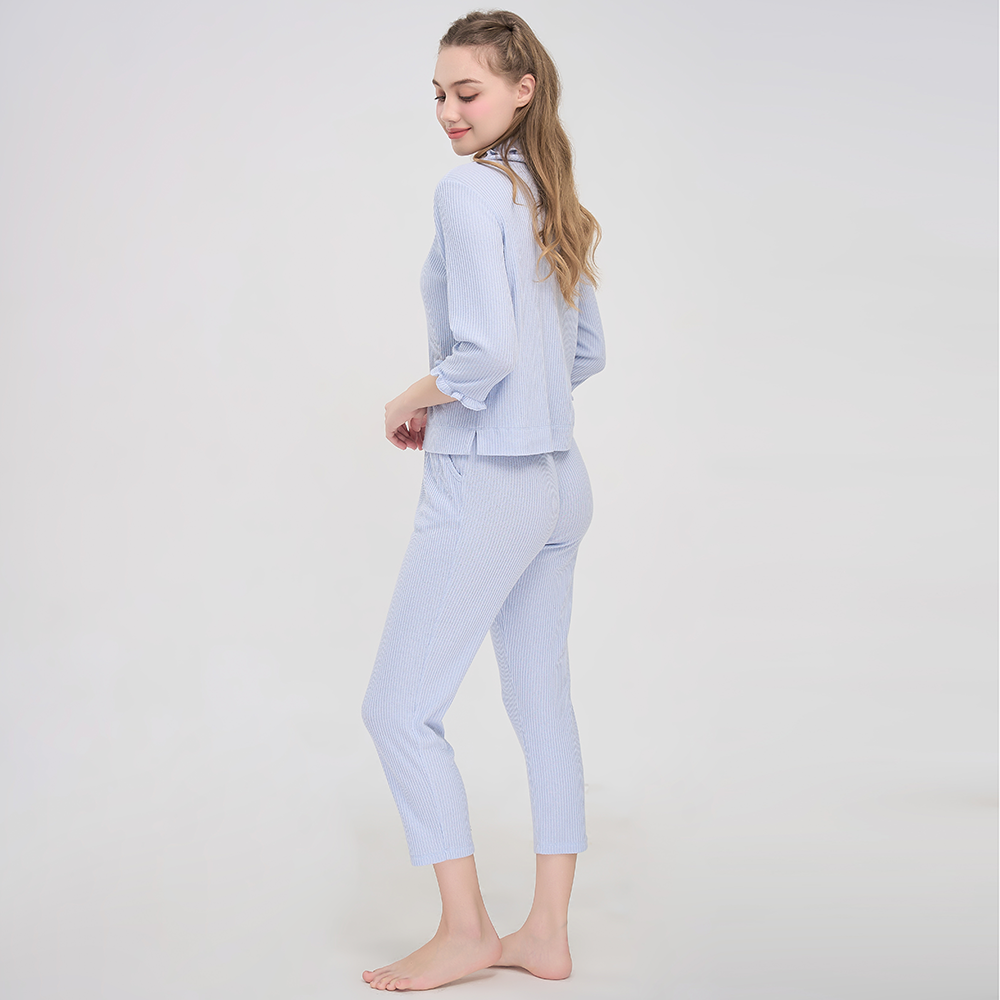 Đặc điểm nổi bật: - Cổ lá sen, tay lỡ - Kẹp ren trắng ở phần lá cổ, lai tay, lai quần - Chất liệu thun - Dáng bộ đồ dài - Thiết kế và