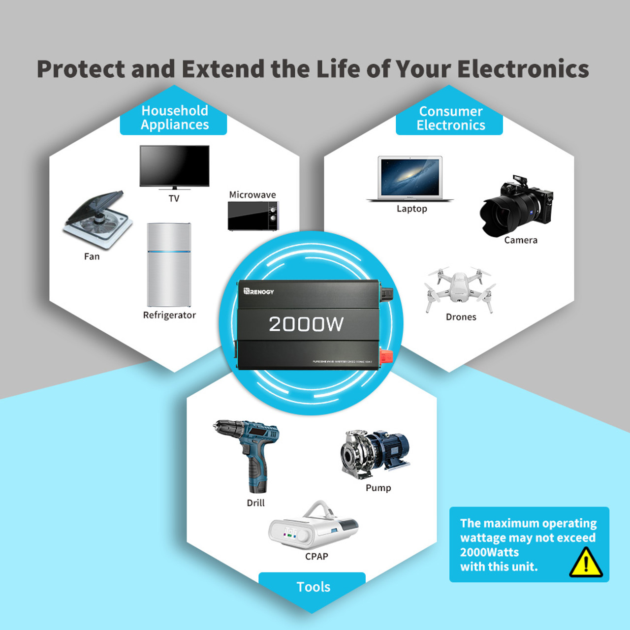 ✨Bộ Đổi Điện Sóng Sin Chuẩn, Bộ Kích Điện INVERTER 12V công suất 2000W thương hiệu RENOGY của MỸ sử dụng trên RV, motorhome và pickup