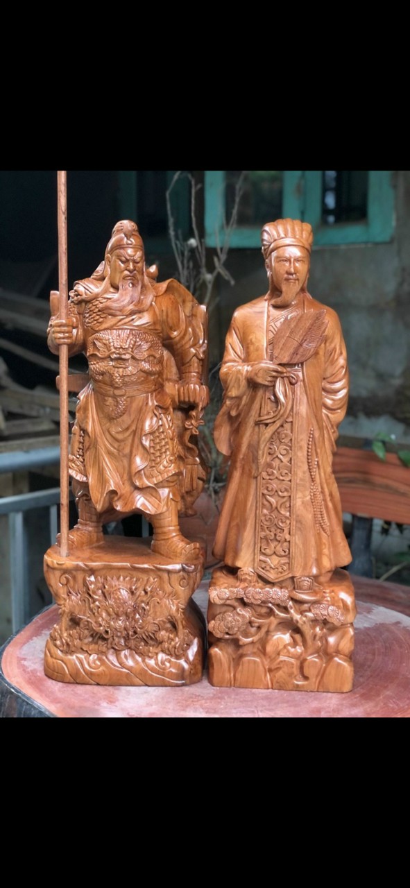 Tượng khổng minh gia cát lượng và tượng quan công .Được làm bằng chất liệu gỗ hương đá tự nhiên 100% Kích thước cao 70×22×14cm khổng minh Kích thươc quan công 70×28×19cm Bộ đôi văn võ song toàn khổng minh và quan công được trạm khắc tỉ mỉ tinh sảo kỳ công ,Đi hầu hết tất cả các đường nét chi tiết nội dung hoa văn của đôi tượng .Đều được chỉnh sửa ngọt tỉa ,Hoàn toàn bằng tay thủ công .Đồng thời tượng được kiểm định rất kỹ lưỡng như cho vào thẩm sấy cho gỗ khô kiệt .Mục đích để trống dập nứt vênh mo mối mọt .Kết hợp với trà nhám đánh giấy giáp nhiều lần cho sạch sẽ .Sờ mát lạnh .Song cho vào phun lót làm bóng mờ .Để giữ lại mầu sắc vân gỗ tự nhiên .Bộ cặp tượng được làm và hoàn thiện do bàn tay khối óc tài hoa ,Chính vì thế bộ cặp tượng văn võ song toàn đã đáp ứng đầy đủ những tiêu trí ( Đẹp bền rẻ ) Thẩm mỹ nghệ thuật với chất lượng tuyệt vời