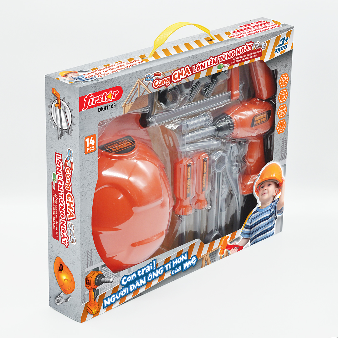 Bộ dụng cụ đồ chơi cho bé, DK 81163 Được mô phỏng với các dụng cụ cần thiết của các chú kỹ sư, công nhân, thợ cơ khíúp các bé trai tha hồ thỏa sức đóng vai và sáng tạo trong việc lắp ráp, sửa chữa các máy móc, đồ dùng vật dụng thường ngày. Thông qua trò chơi giúp bé định hướng nghề nghiệp và mang tới rất nhiều niềm vui cũng như kỹ năng hữu ích cho trẻ; Giúp trẻ bồi dưỡng nhận thức trực quan Phát triển sự phối hợp giữa tay và mắt Tăng cường ý thức trách nhiệm với cộng đồng Nhập vai và trải nghiệm cuộc sống Thông tin sản phẩm: