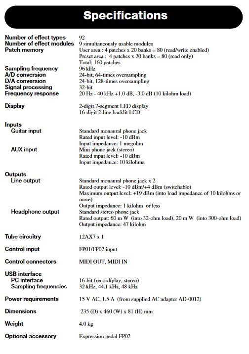 THÔNG SỐ KỸ THUẬT: - 40 effects - Các nút ấn: Save, Home/Global, Comp, EFX, Amp, IR, EQ, MOD, Delay, Reverb - Nút điều khiển: Master, Exp, Control 4 x Settings - Công suất tiêu