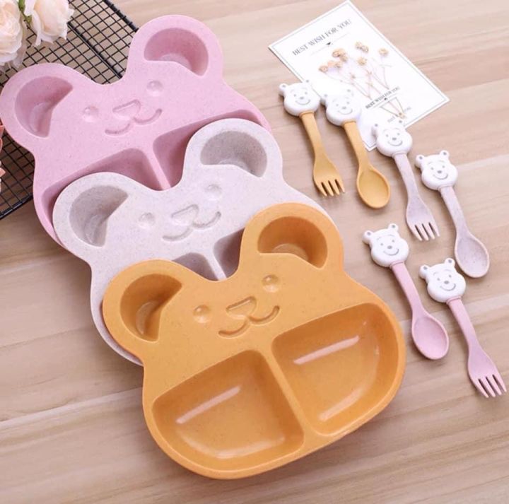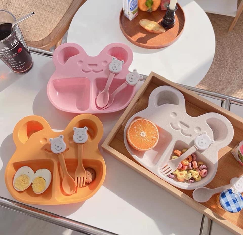 ✨Bộ Khay Ăn Dặm Cho Bé 2 Ngăn Hình Gấu (kèm Muỗng, Nĩa) - hàng cao cấp