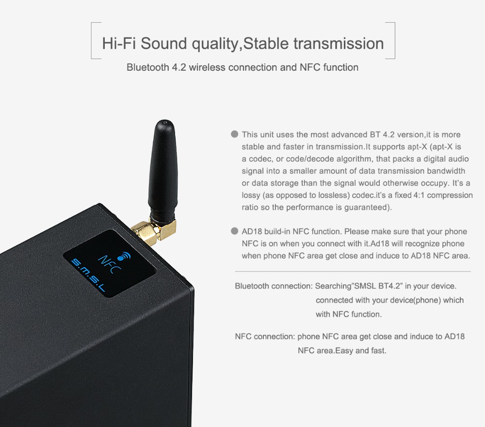 Bộ Khuếch Đại Âm Thanh S.M.S.L AD18 Full Digital Decoder Audio Amplifier Stereo Headphone Amp of 80W Power Support Optical/ BT/ Coaxial/ USB - Hàng Chính Hãng AD 18 là bộ khuếch đại bluetooth kỹ