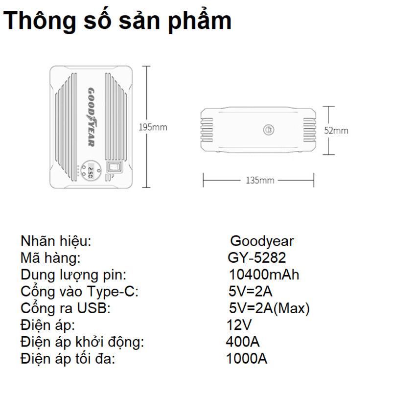 ✨Bộ kích bình ắc quy kiêm bơm lốp và sạc dự phòng dung lượng 10400mAh dùng cho ô tô thương hiệu Mỹ cao cấp Goodyear GY-5282 - Hàng Nhập Khẩu