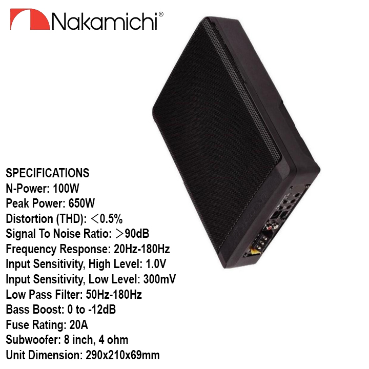 - Dòng loa Nakamichi NBF20.0A là loại loa siêu trầm cao cấp nhất hiện nay trong phân khúc, sản phẩm đặt gầm ghế cực kỳ gọn gàng, phù hợp với tất cả các xe phổ thông muốn lên đời.