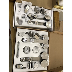 bộ lùa treo  gồm : 2 bánh xe, loại bắt lục, siết cực kì chắc, inox 304 loại mờ 4 con đỡ ống inox 2 chặn kính 1 định vị dẫn hướng 2 đầu bịt