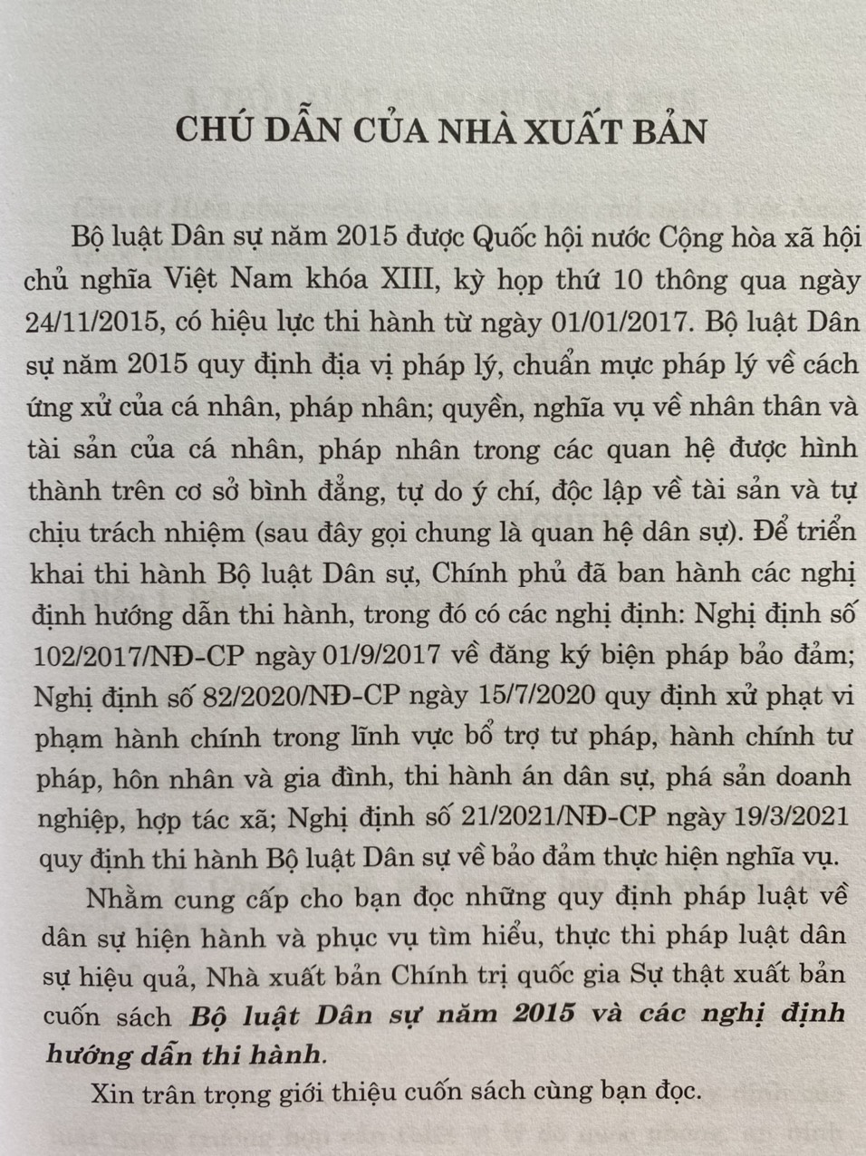 Bộ luật Dân sự năm 2015 được Quốc hội khóa XIII, kỳ họp thứ 10 thông qua ngày 24/11/2015, có hiệu lực thi hành từ ngày 01/01/2017. Bộ luật Dân sự năm 2015 quy định địa vị pháp lý, chuẩn mực pháp lý về cách ứng xử của cá nhân, pháp nhân; quyền, nghĩa vụ về nhân thân và tài sản của cá nhân, pháp nhân trong các quan hệ được hình thành trên cơ sở bình đẳng, tự do ý chí, độc lập về tài sản và tự chịu trách nhiệm. Để triển khai thi hành Bộ luật Dân sự năm 2015, Chính phủ đã ban hành các nghị định hướng dẫn thi hành, trong đó có các nghị định: Nghị định số 102/2017/NĐ-CP ngày 01/9/2017 về đăng ký biện pháp bảo đảm; Nghị định số 82/2020/NĐ-CP ngày 15/7/2020 quy định xử phạt hành chính trong lĩnh vực bổ trợ tư pháp, hành chính tư pháp, hôn nhân và gia đình, thi hành án dân sự, phá sản doanh nghiệp, hợp tác xã; Nghị định số 21/2021/NĐ-CP ngày 19/3/2021 quy định thi hành Bộ luật Dân sự về bảo đảm thực hiện nghĩa vụ. Cuốn sách là tài liệu quý, cung cấp cho độc giả những quy định pháp luật về dân sự hiện hành và phục vụ tìm hiểu, thực thi có hiệu quả pháp luật dân sự.