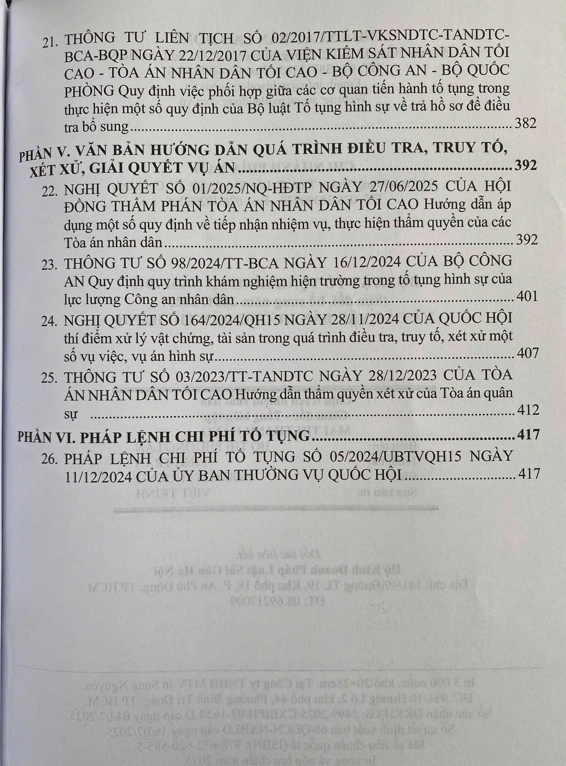 Thời gian qua nhiều văn bản hướng dẫn thi hành Bộ luật Tố tụng hình sự cũng được ban hành như: Thông tư liên tịch 05/2025/TTLT-BCA-BQP-VKSNDTC-TANDTC ngày 01/7/2025 Quy đ. ịnh về phối hợp giữa các cơ quan tiến hành tố tụng trong điều tra, truy tố, xét xử vắng mặt bị can, bị cáo, Thông tư liên tịch 04/2025/TTLT-BCA-VKSNDTC-TANDTC ngày 27/06/2025 Quy đ. ịnh về phối hợp giữa các cơ quan có thẩm quyền trong hoạt động tố tụng hình sự, quản lý, thi hành tạm giữ, tạm giam và thi hành án hình sự…