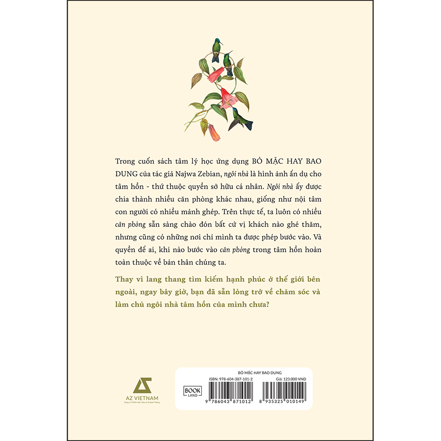 Trong cuốn sách tâm lý học ứng dụng BỎ MẶC HAY BAO DUNG của tác giả Najwa Zebian, “ngôi nhà” là hình ảnh ẩn dụ cho tâm hồn - thứ thuộc quyền sở hữu cá nhân. Ngôi nhà ấy được chia thành nhiều căn phòng khác nhau, giống như nội tâm con người có nhiều mảnh ghép. Trên thực tế, ta luôn có nhiều căn phòng sẵn sàng chào đón bất cứ vị khách nào ghé thăm, nhưng cũng có những nơi chỉ mình ta được phép bước vào. Và quyền để ai, khi nào bước vào căn phòng trong tâm hồn hoàn toàn thuộc về bản thân chúng ta.