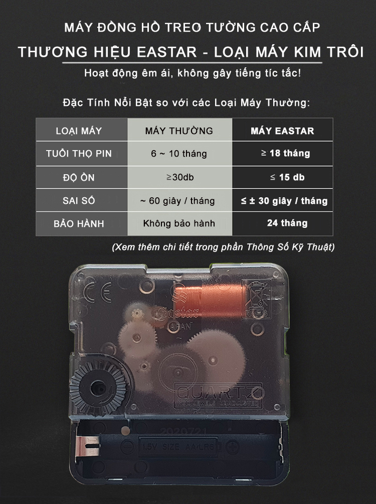 Các dòng Máy đồng hồ Eastar đều là máy Kim trôi cao cấp, thiết kế hiện đại, chất lượng, ổn định, chính xác, bền bỉ, khả năng chết IC, hay hỏng hóc bánh răng là rất thấp. Máy đồng hồ khi hoạt động rất êm ái, kim không giật, không tạo ra tiếng tíc tắc như loại truyền thống, đảm bảo không gây bất kỳ tiếng động dù là nhỏ nào khi treo trong không gian im ắng, vì vậy có thể hoàn toàn an tâm khi sử dụng trong phòng ngủ hay các không gian cần sự tĩnh lặng.