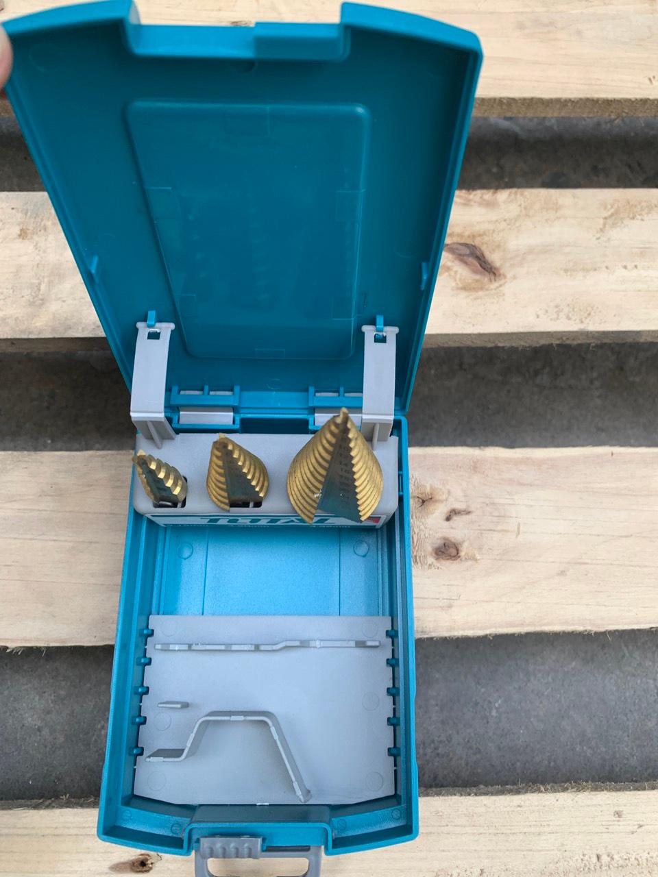 -Bộ 3 mũi khoan chóp nón gồm:1 pcs 4-12 mm, 1mm/bậc , đk đuôi: 6mm. 1 pcs 4-20 mm, 2mm/bậc , đk đuôi: 8mm