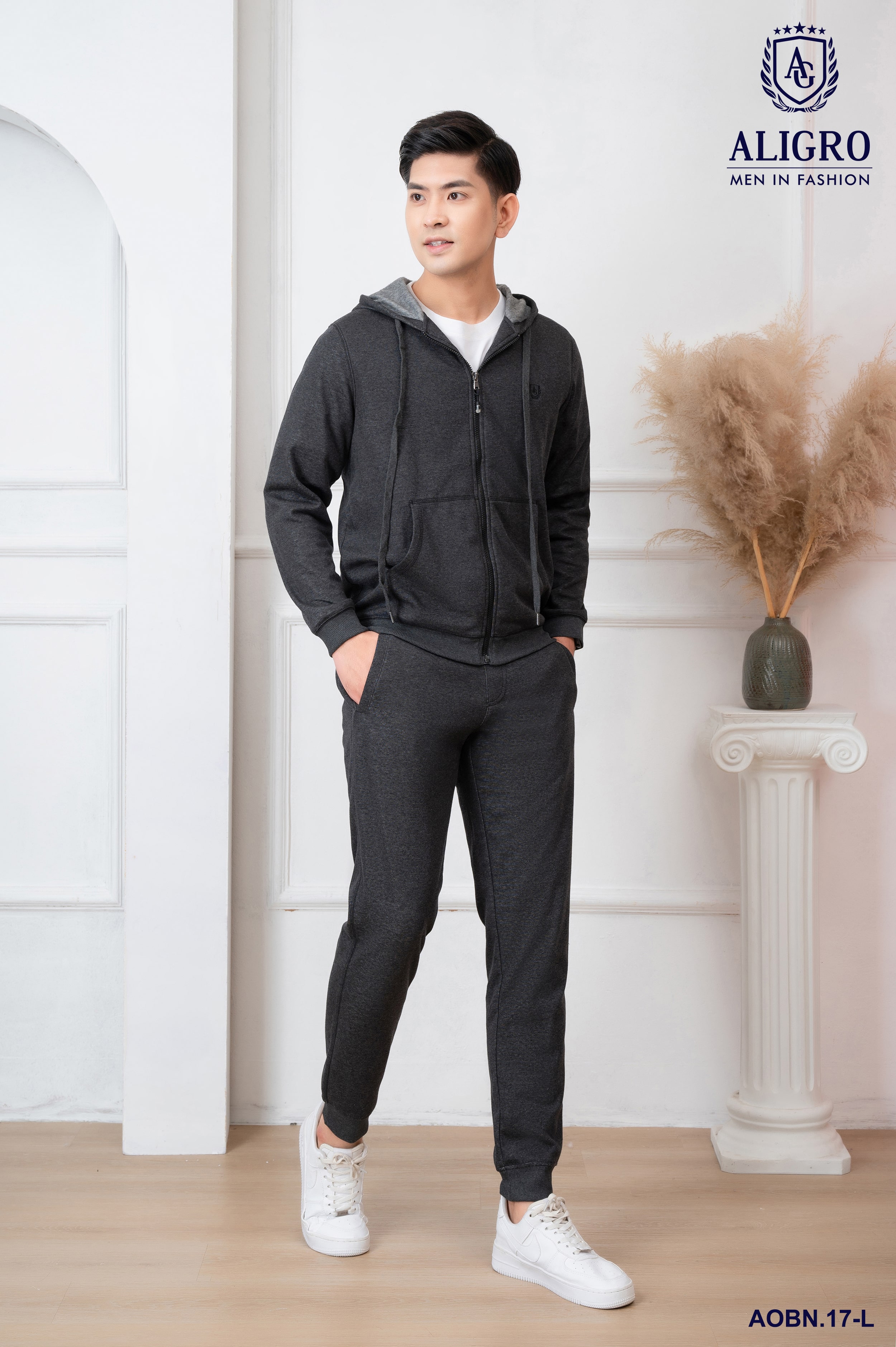 ✨Bộ nỉ hoddie nam ALIGRO kéo khóa có mũ màu ghi đậm BN.17
