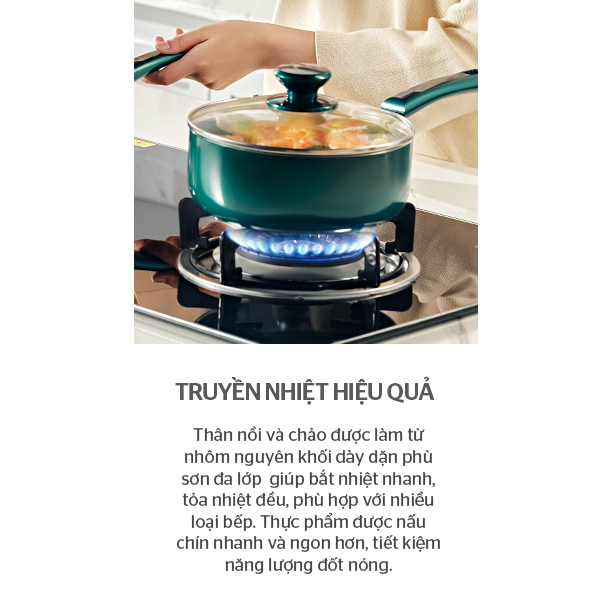 Thân nồi và chảo được làm từ nhôm nguyên khối dày dặn phủ sơn đa lớp giúp bắt nhiệt nhanh, tỏa nhiệt đều, phù hợp với nhiều loại bếp. Thực phẩm được nấu chín nhanh và ngon hơn, tiết kiệm năng lượng đốt nóng.