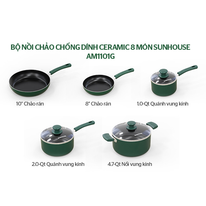 Xoong Nhỏ: 20 x 10 cm 2.5L Nồi Hầm: 24 x 12 cm 4.1L Chảo Chiên Nhỏ 20 x 4.5 cm 1.0L Chảo Rán Vừa 24 x 4.5 cm 1.7L Đánh bột x 1 Muôi