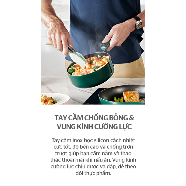 Tay cầm inox bọc silicon cách nhiệt cực tốt, độ bền cao và chống trơn trượt giúp bạn cầm nắm và thao tác thoải mái khi nấu ăn. Vung kính cường lực chịu được va đập, dễ theo dõi thực phẩm.