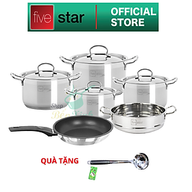 Bộ nồi chảo xửng hấp 3 Đáy Inox 430 cao cấp Fivestar Standard bếp từ nắp kính , tặng 1 vá canh Bộ nồi inox có 9 món gồm : +Quánh có đường kính