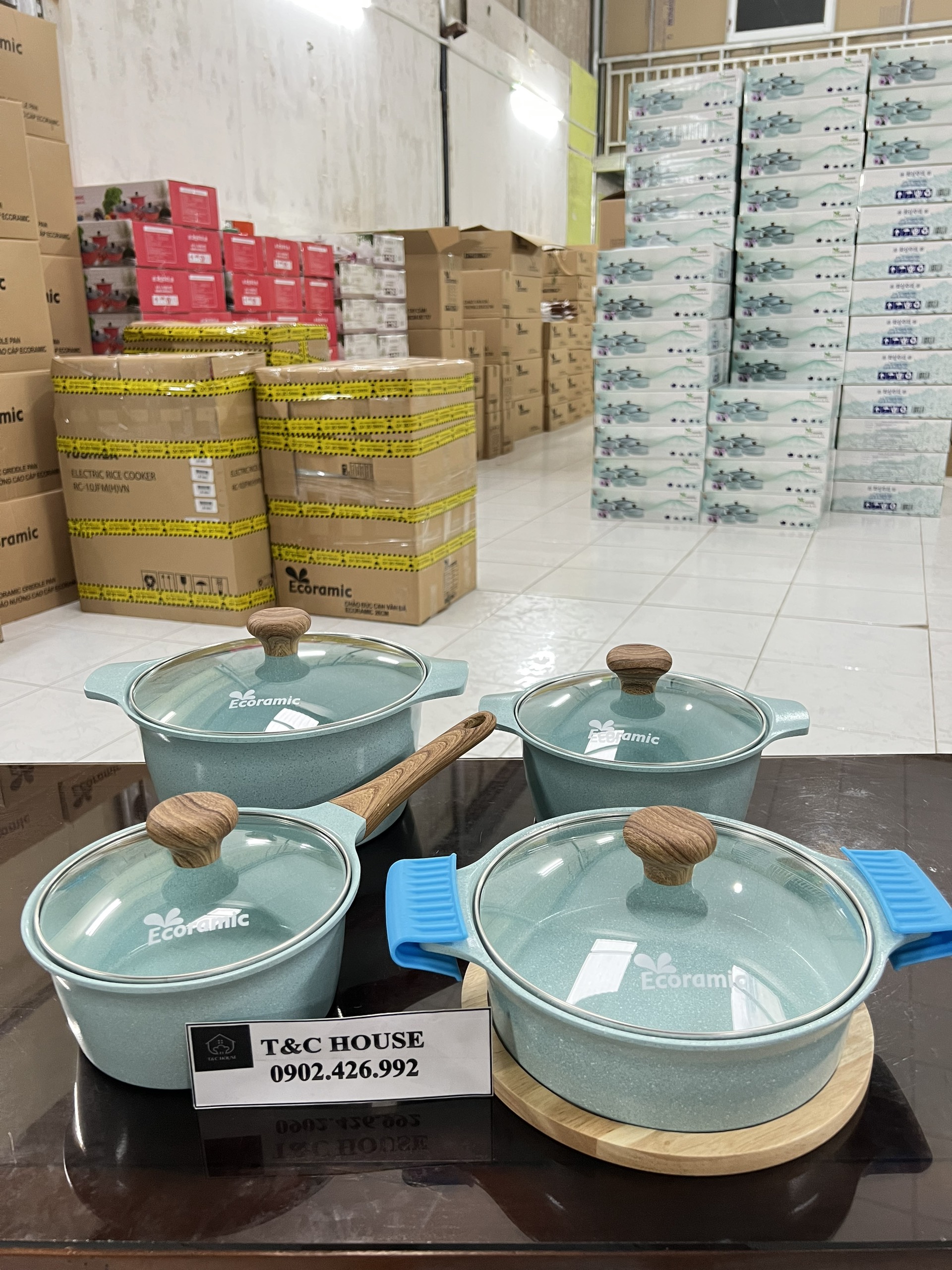 Set gồm 6 món tiện dụng: • Chảo nhỏ 20cm & chảo lớn 24cm • Quánh nhỏ 16cm & quánh lớn 18cm (đều kèm nắp) • Nồi nhỏ 24cm & nồi lớn 24cm (đều kèm