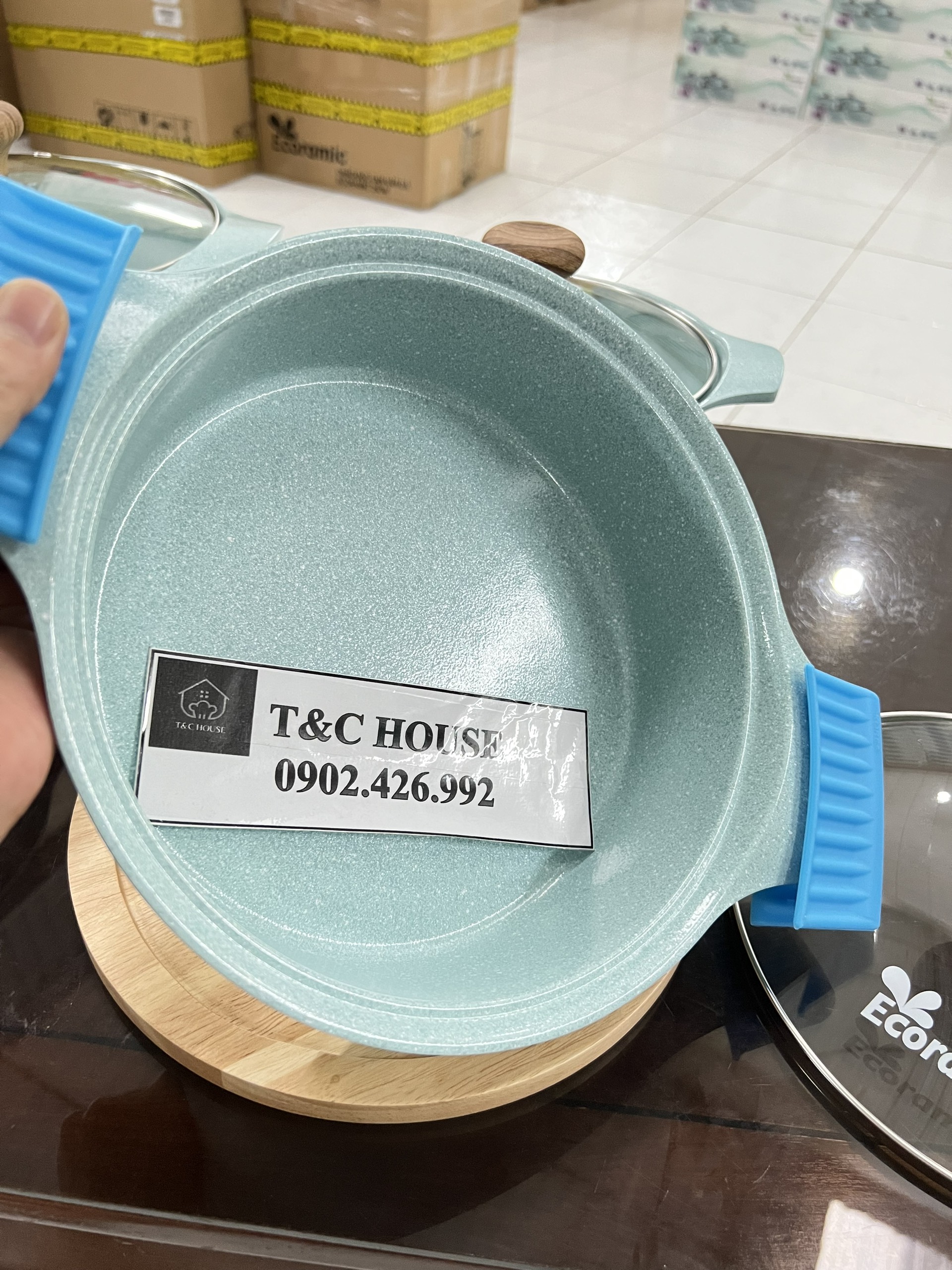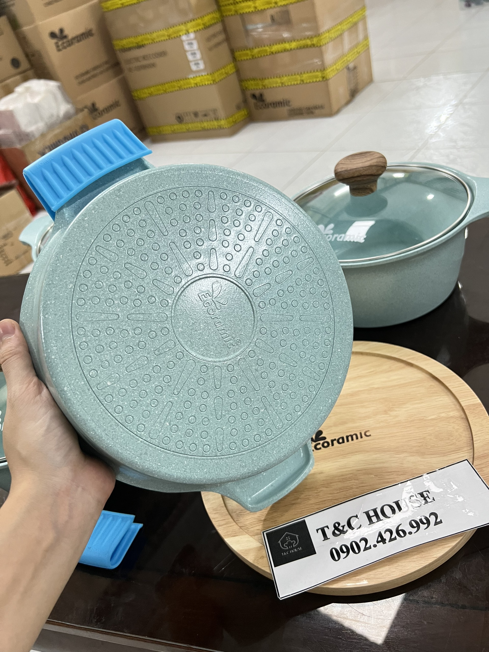 Bộ sản phẩm bao gồm: - 1 Nồi 2 tay cầm đáy từ 20cm Seoulcook Luxury màu xanh oliu + nắp kính 20cm - 1 Chảo vuông đáy từ Seoulcook 15x20 cm màu đen vân