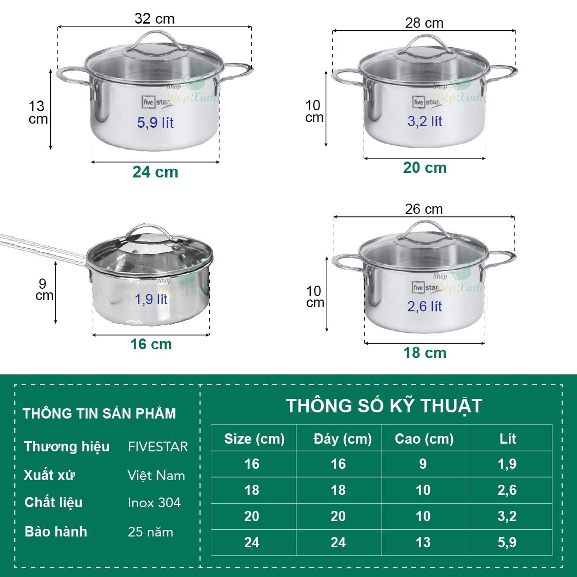 • Bộ nồi Inox 304 cao cấp 3 món 5 thứ : + Nồi cao cấp có nắp kích thước 16x8 cm + Nồi cao cấp có nắp kích thước 24x14 tcm + Chảo cao