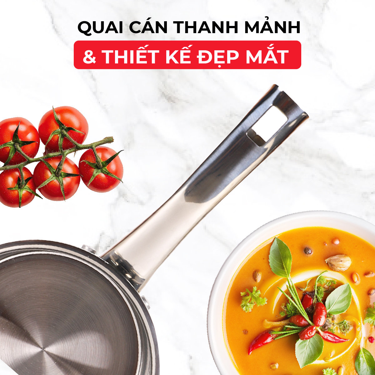 - Chất liệu: Inox cao cấp 18/10 - Đáy: Làm bằng thép sắt từ gồm 5 lớp cho phép dẫn nhiệt nhanh, phân phối nhiệt tối ưu - Thiết kế kết cấu chống trơn trượt: