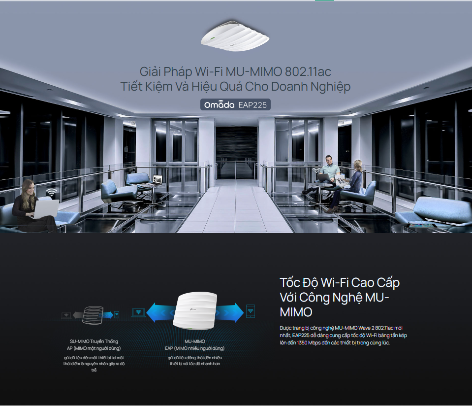 Access Point Wi-Fi Gắn Trần Gigabit AC1350 MU-MIMO -Wi-Fi Băng Tần Kép Nhanh: Đồng thời 450 Mbps trên 2.4 GHz△ và 867 Mbps trên 5 GHz đồng thời, tổng cộng là 1317 Mbps tốc độ Wi-Fi.† -Được tích hợp vào Omada SDN: Zero-Touch Provisioning (ZTP)‡, Quản lý cloud tập trung và Giám sát thông minh. -Quản Lý Tập Trung: Truy cập cloud và ứng dụng Omada để quản lý cực kỳ tiện lợi và dễ dàng. -Chuyển Vùng Liền Mạch: Ngay cả các luồng video và cuộc gọi thoại cũng không bị ảnh hưởng khi người dùng di chuyển giữa các vị trí -Hỗ Trợ PoE: Hỗ trợ cả chuẩn 802.3af / at và Passive PoE (bao gồm bộ chuyển đổi PoE)△ để cài đặt linh hoạt. -Mạng Khách An Toàn: Cùng với nhiều tùy chọn xác thực (SMS / Voucher, v.v.) và các công nghệ bảo mật không dây phong phú. -Công Nghệ Không Dây Tiên Tiến: Tối ưu hóa hiệu suất mạng với các công nghệ MU-MIMO, Band Steering, Airtime Fairness và Beamforming.△
