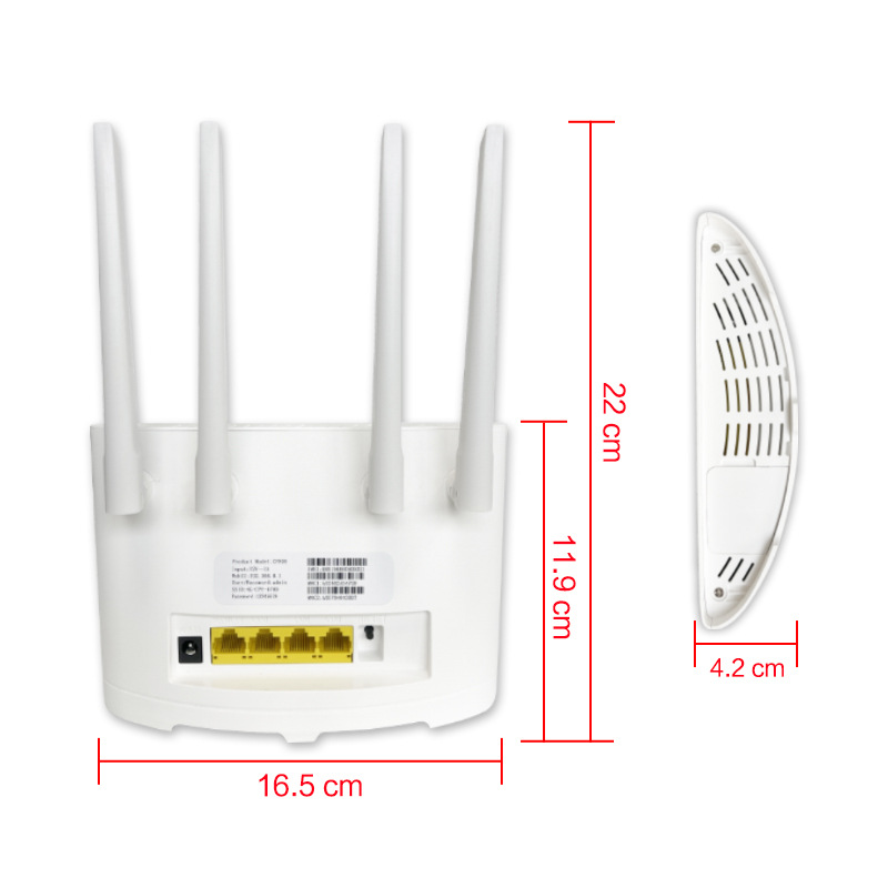 Giao tiếp 1 × 10/100 Mbps LAN/WAN Port; 1 × 10/100 Mbps LAN Port; 1 × 2FF SIM Card Slot Tốc độ Tốc độ Wifi: 2.4GHz:300Mbps; 5.8GHz:867Mbps/ Tốc độ 4G: DL:150Mbps UL:50Mbps Dải tần số