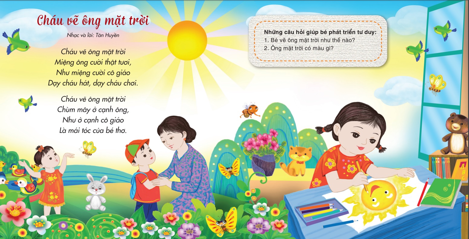Sau mỗi bài hát là phần câu hỏi đặt ra để bé phát triển tư duy. Chẳng hạn, ở ca khúc “Ba ngọn nến lung linh”, bé sẽ phải trả lời các câu hỏi như: Các màu sắc tương ứng với từng cây nến, Đối với bé thì gia đình là nơi như thế nào?