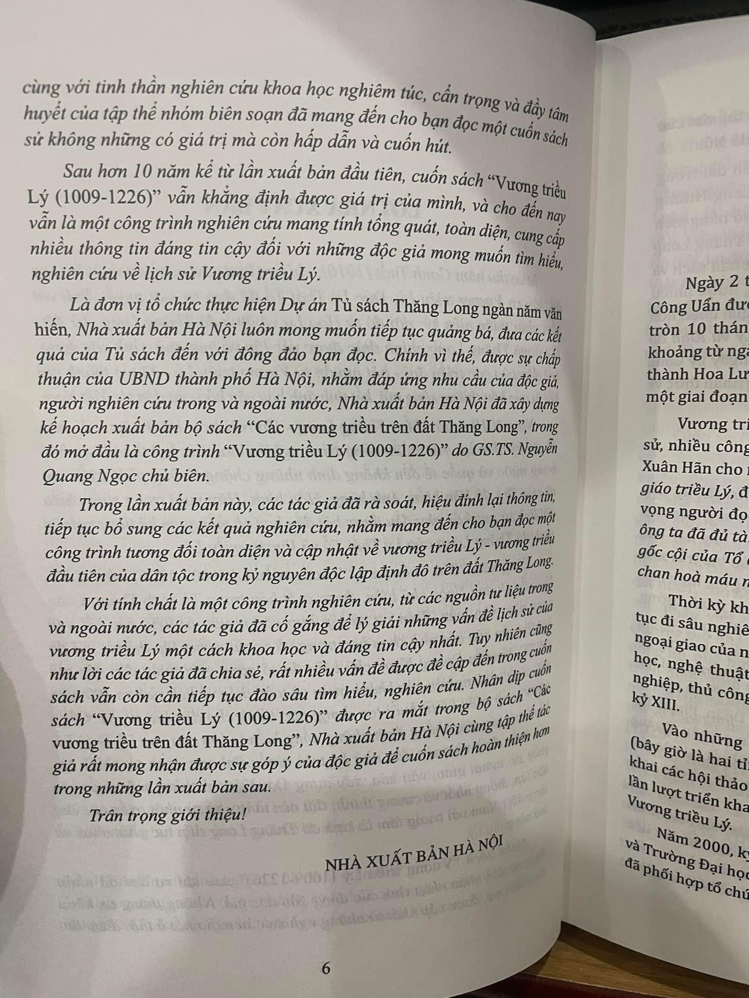 VƯƠNG TRIỀU LÝ (1009-1226) Niềm hứng khởi từ một triều đại hoàng kim, rực rỡ đi theo suốt dặm dài thời gian với các nhà nghiên cứu và chép sử. Ở mỗi thời đoạn lịch sử, không chỉ với các chuyên gia sử mà quân sự, chính trị, văn hó đã khơi nguồn từ vương triều Lý. Qua mỗi chặng đường, các nhà nghiên cứu lại phát lộ những lớp trầm tích văn hóa thời Lý. Đặc biệt Những năm đầu thế kỷ XXI đã chứng kiến một bước tiến dài trong nghiên cứu và nhận thức về Vương triều Lý và Kinh đô Thăng Long. Những phát hiện khảo cổ học ở 18 Hoàng Diệu đã cung cấp một pho sử bằng hiện vật thật hết sức cụ thể và sinh động không chỉ về toà thành Thăng Long mà còn về Vương triều Lý.
