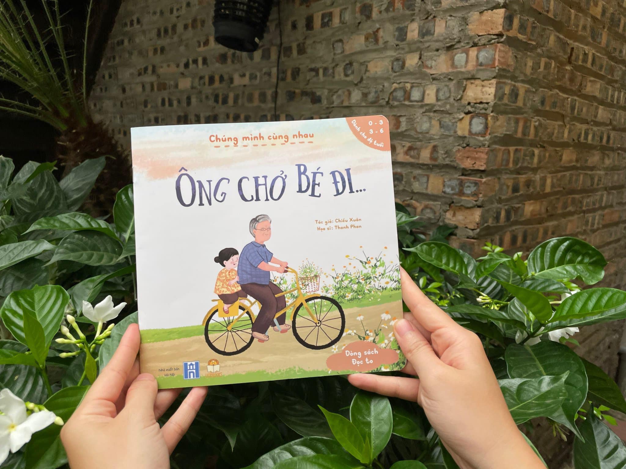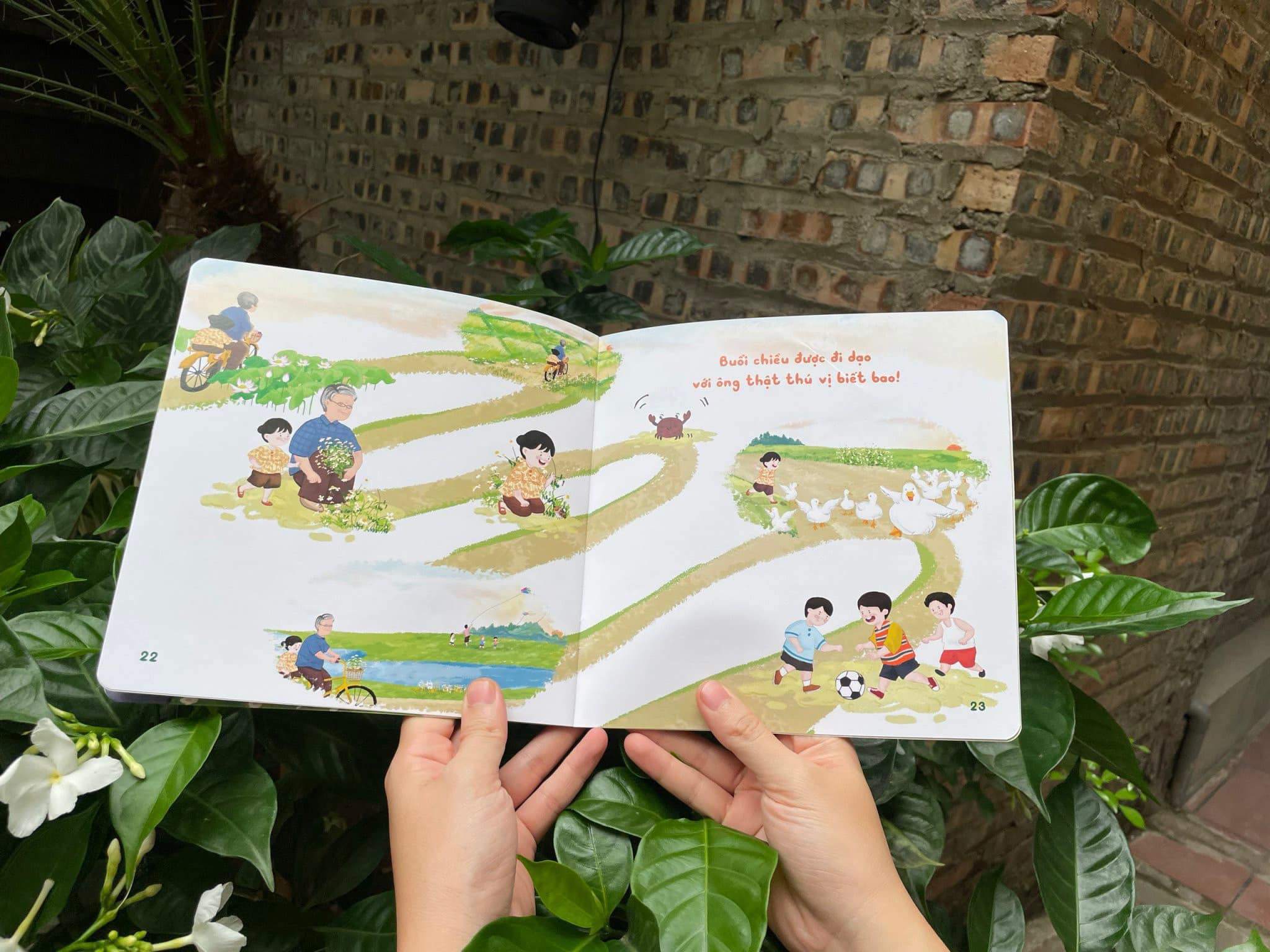 ÔNG CHỞ BÉ ĐI - Rong ruổi khắp triền đê trên xe đạp của ông hẳn sẽ là hoạt động mà bạn nhỏ nào cũng mê: được ngắm hoàng hôn trên cánh đồng này, được xem các bạn vịt nối đuôi nhau về chuồng này, được hái bông hoa dại nhỏ xinh làm một bó tặng bà nữa chứ! Nghe thôi đã thấy háo hức và đáng yêu vô cùng rồi!
