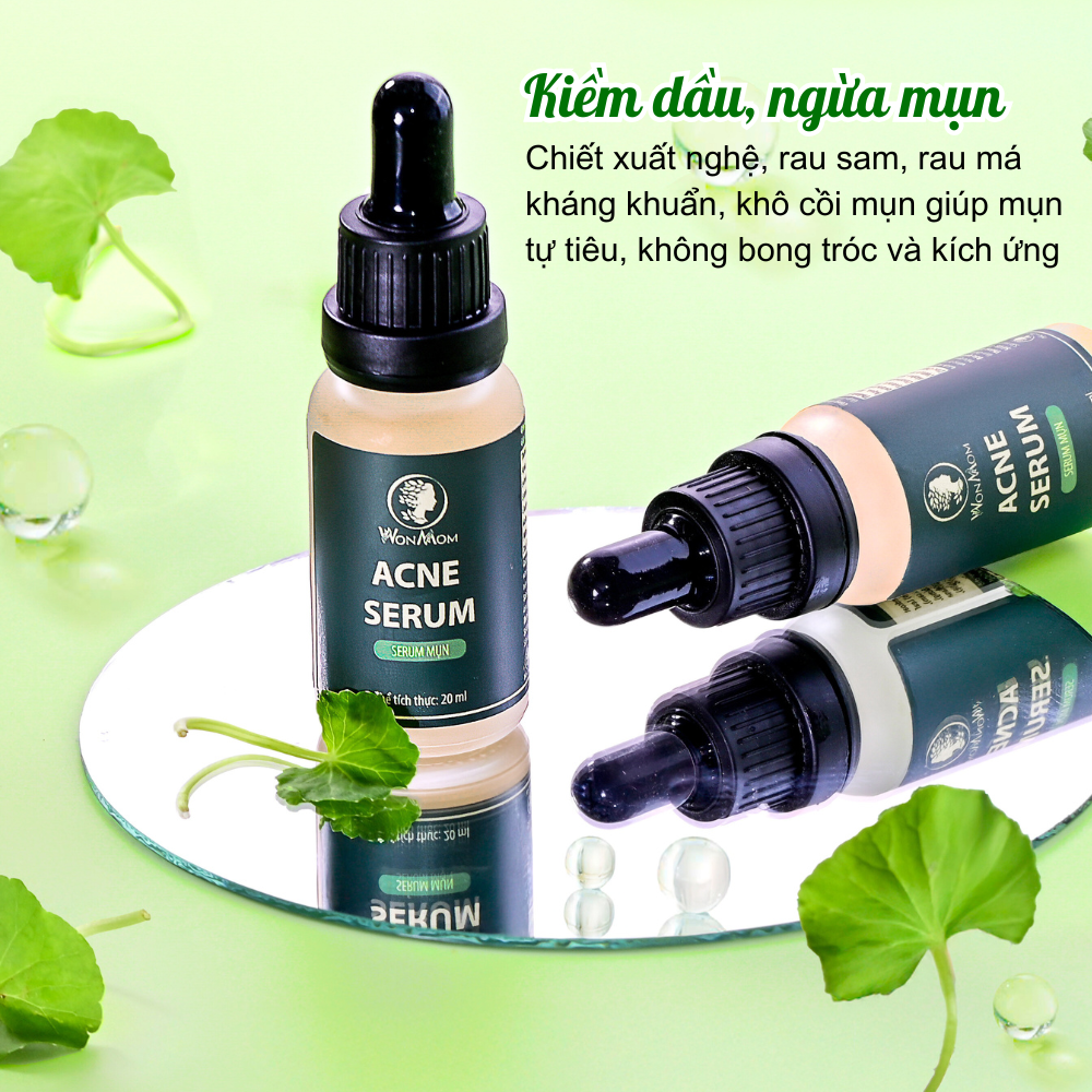 - Serum mụn Wonmom được chiết xuất rau má, lộc đề, ZinC bum, vitamin B5 giúp kiềm dầu, khô cồn, tiêu nhân mụn.